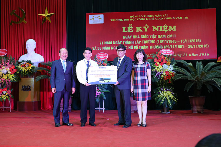 Đại diện Công ty CP Ô tô Trường Hải Thaco tặng quà chúc mừng trường Đại học Công nghệ GTVT nhân dịp 20/11