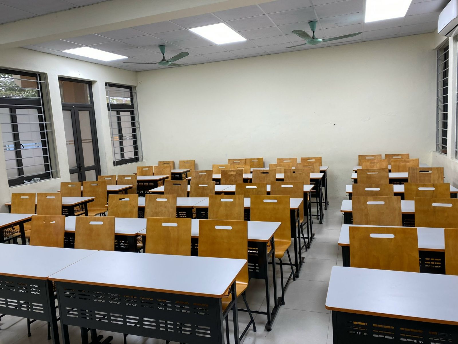 Phòng học được trang bị điều hòa, máy chiếu, màn hình tương tác.