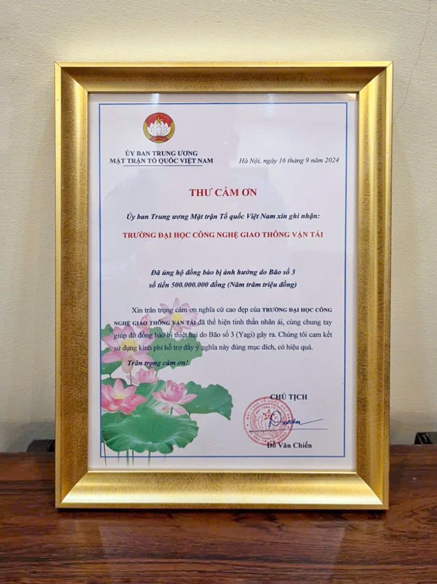 Thư cảm ơn Trường Đại học Công nghệ GTVT của Ủy ban Trung ương MTTQ Việt Nam.