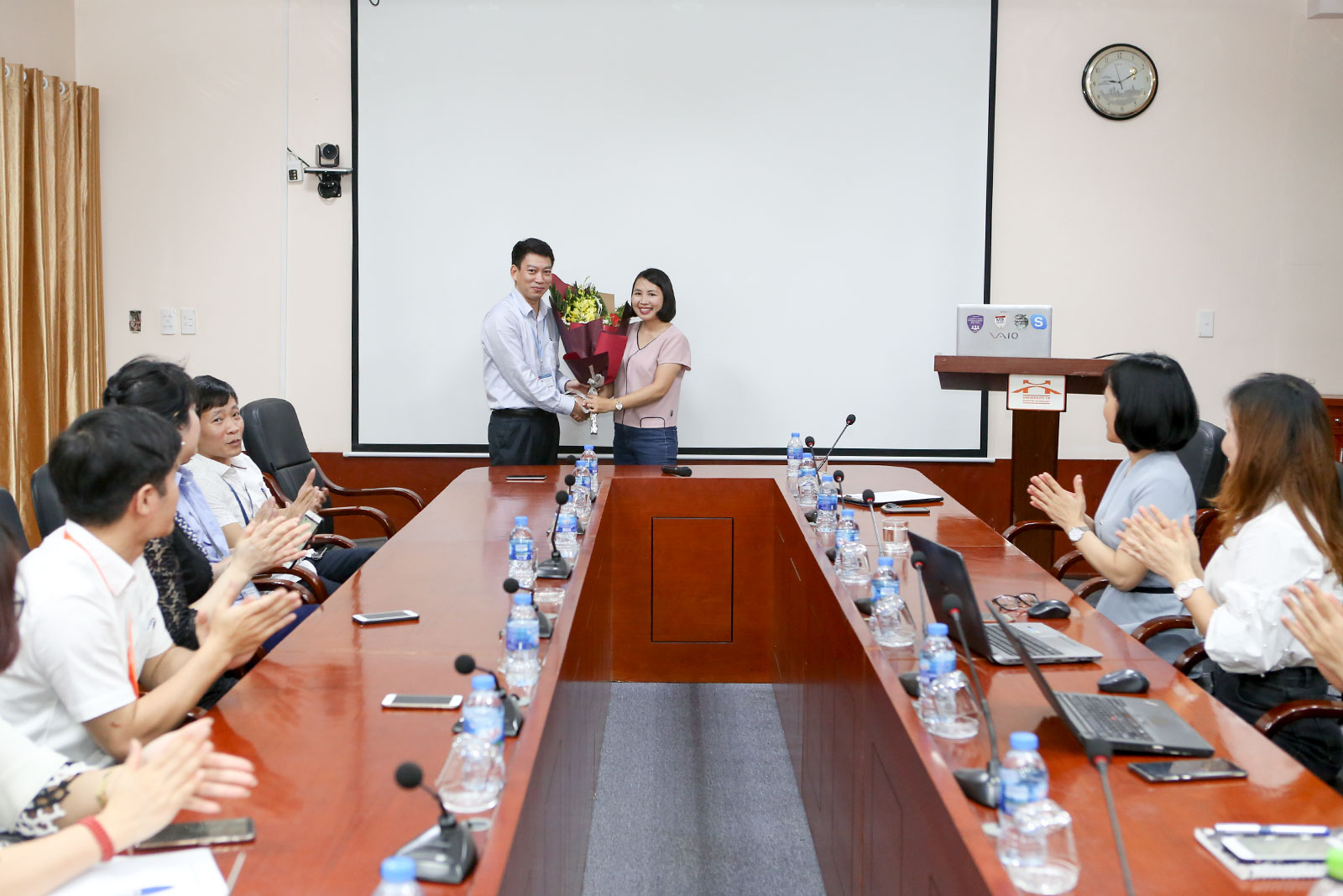 PGS.TS. Đào Văn Đông tặng hoa chúc mừng diễn giả Trần Thị Thúy