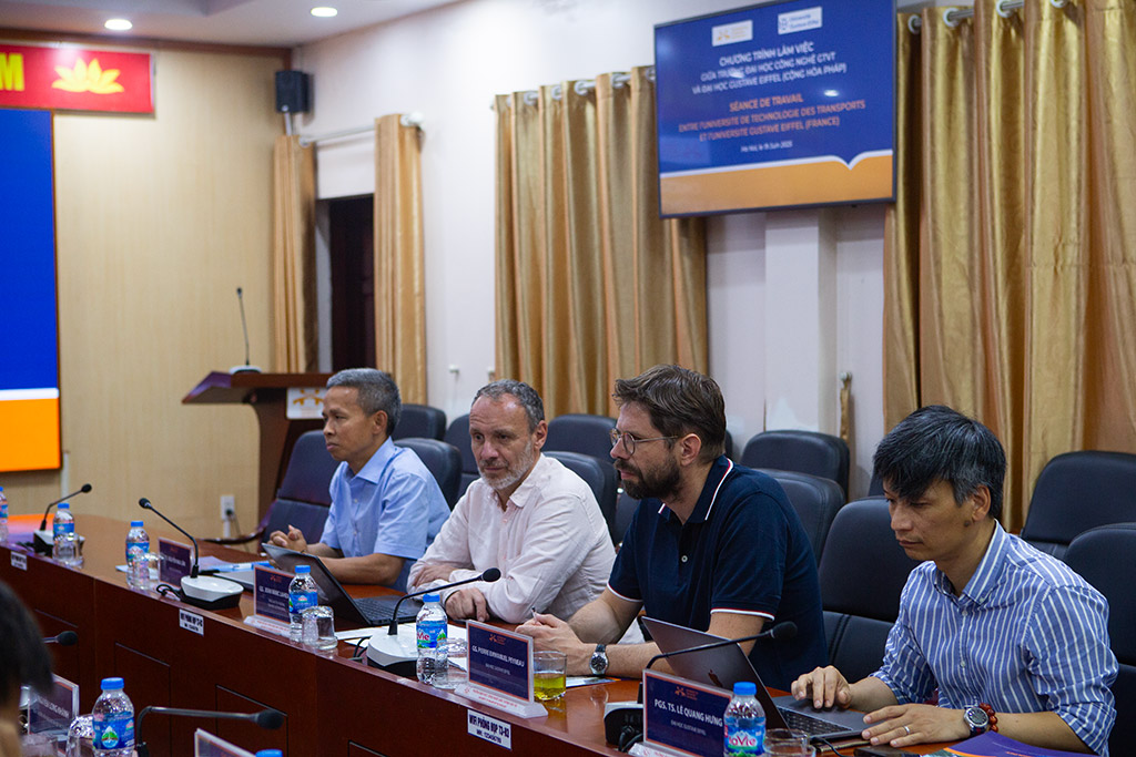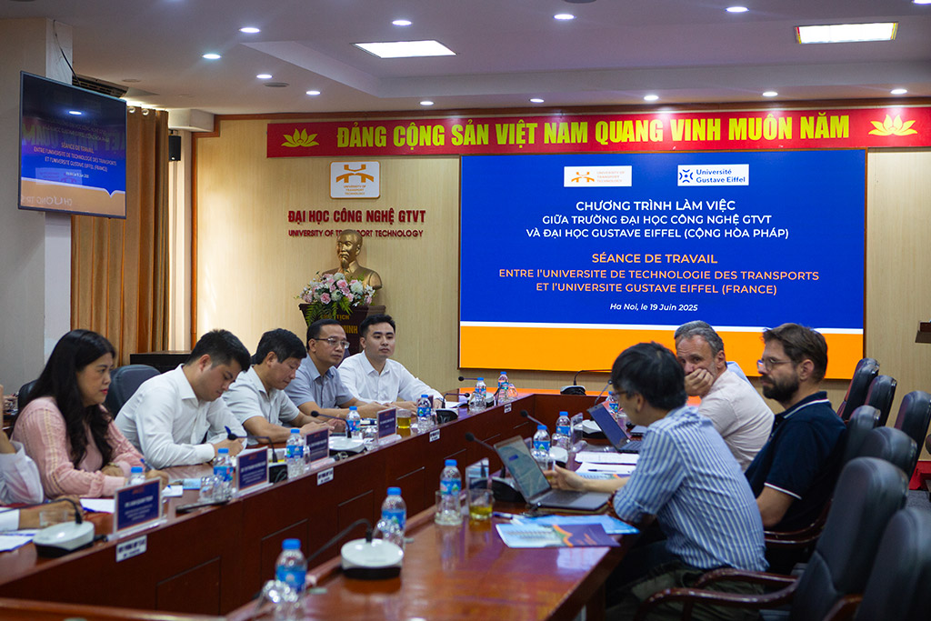 Sáng ngày 19/6/2025, Trường Đại học Công nghệ GTVT (UTT) đã đón tiếp đoàn đại biểu Trường Đại học Gustave Eiffel (Cộng hòa Pháp) do Giáo sư Jean Marc Laheurte - Phó Chủ tịch Trường dẫn đầu sang thăm và làm việc. Tham dự buổi tiếp và làm việc có PGS.TS. Nguyễn Hoàng Long - Hiệu trưởng Nhà trường, cùng lãnh đạo Viện Đào tạo và Hợp tác Quốc tế, Phòng Đào tạo, Phòng Khoa học Công nghệ & Hợp tác Quốc tế.