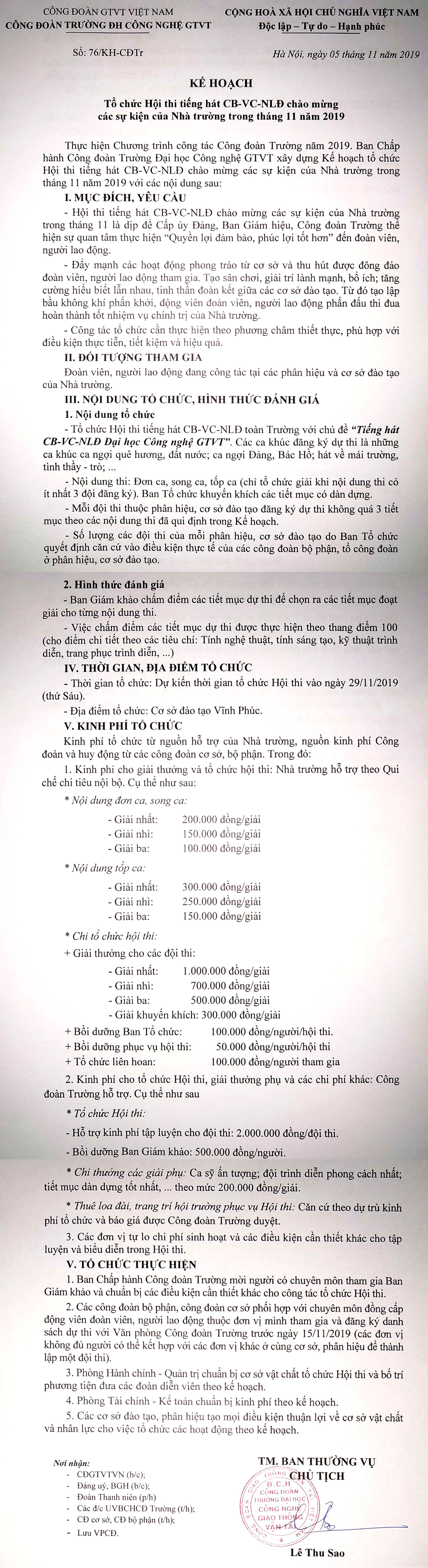 Kế hoạch Tổ chức Hội thi tiếng hát CB-VC-NLĐ chào mừng các sự kiện của Nhà trường trong tháng 11 năm 2019 08/11/2019 02:11