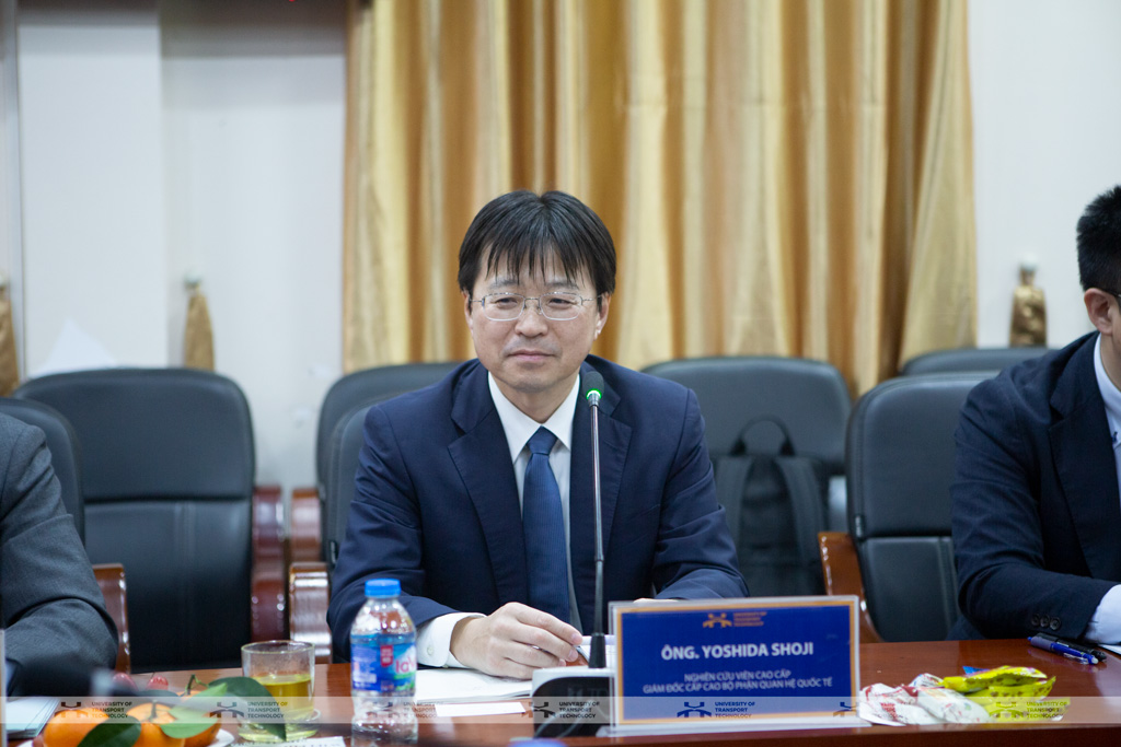 Đại diện phía JTTRI, Ông Yoshida Shoji bày tỏ sự trân trọng trước sự đón tiếp nồng hậu của Trường Đại học Công nghệ GTVT. Ông cũng chia sẻ "JTTRI luôn tìm kiếm các đối tác tiềm năng để mở rộng hợp tác nghiên cứu và trao đổi học thuật. Chúng tôi rất ấn tượng với những thành tựu của Trường Đại học Công nghệ GTVT trong lĩnh vực nghiên cứu và đào tạo. Hy vọng trong thời gian tới, hai bên sẽ có nhiều dự án hợp tác cụ thể, đặc biệt trong các lĩnh vực liên quan đến giao thông đô thị, đường sắt tốc độ cao và phát triển bền vững."