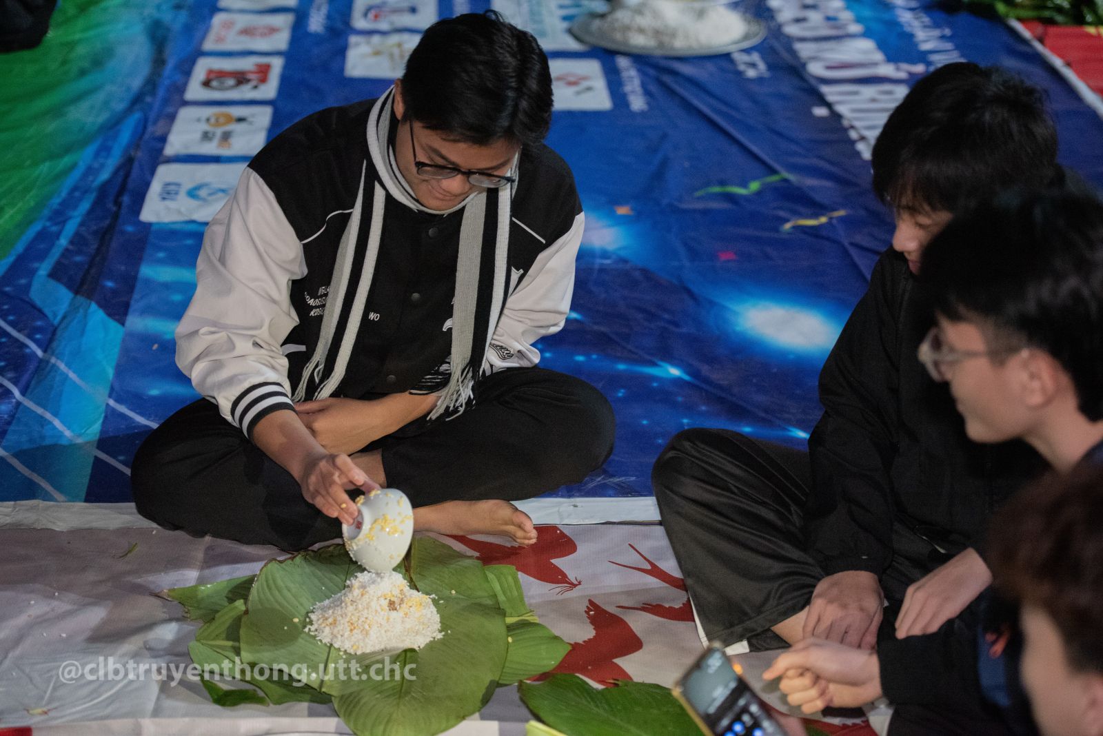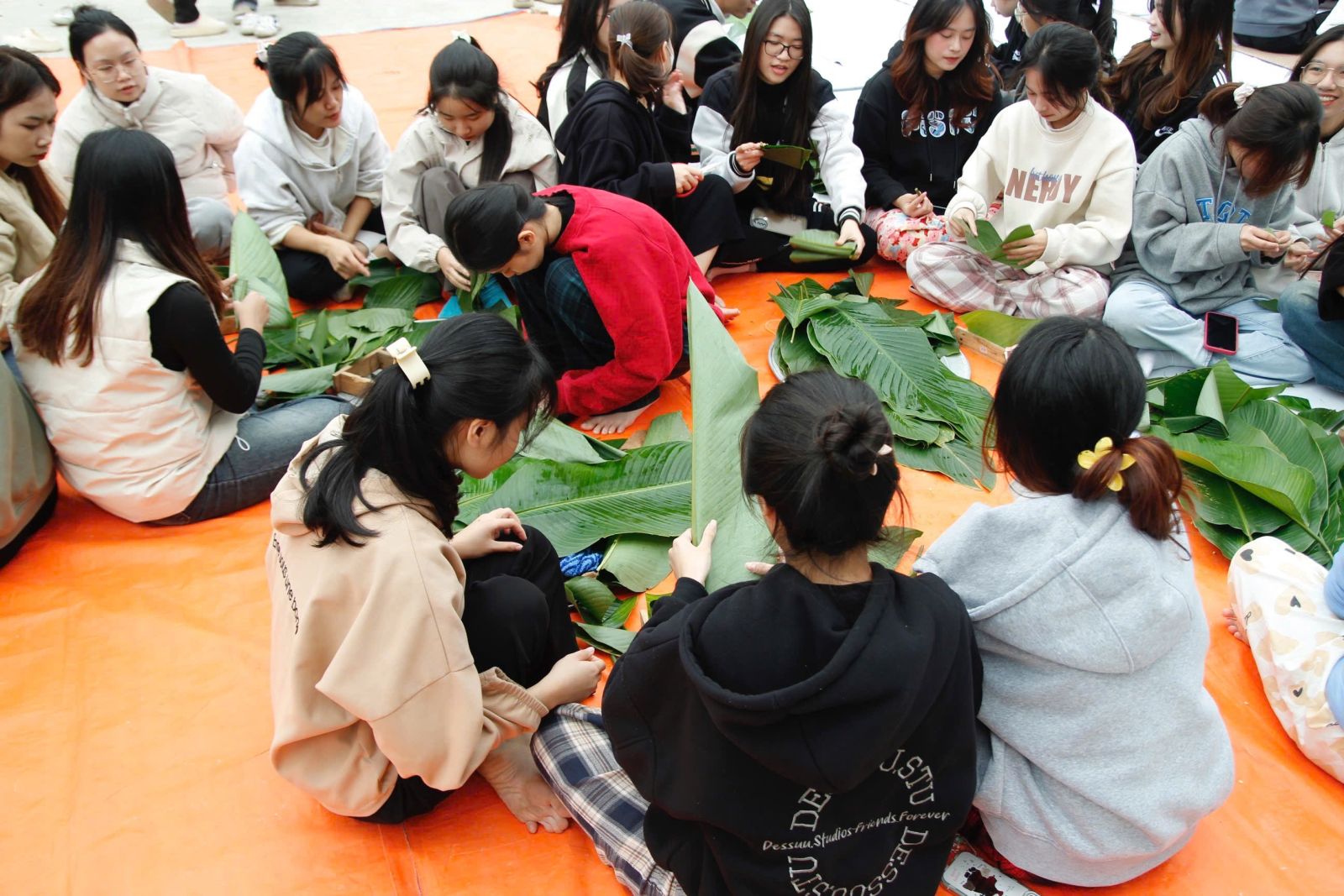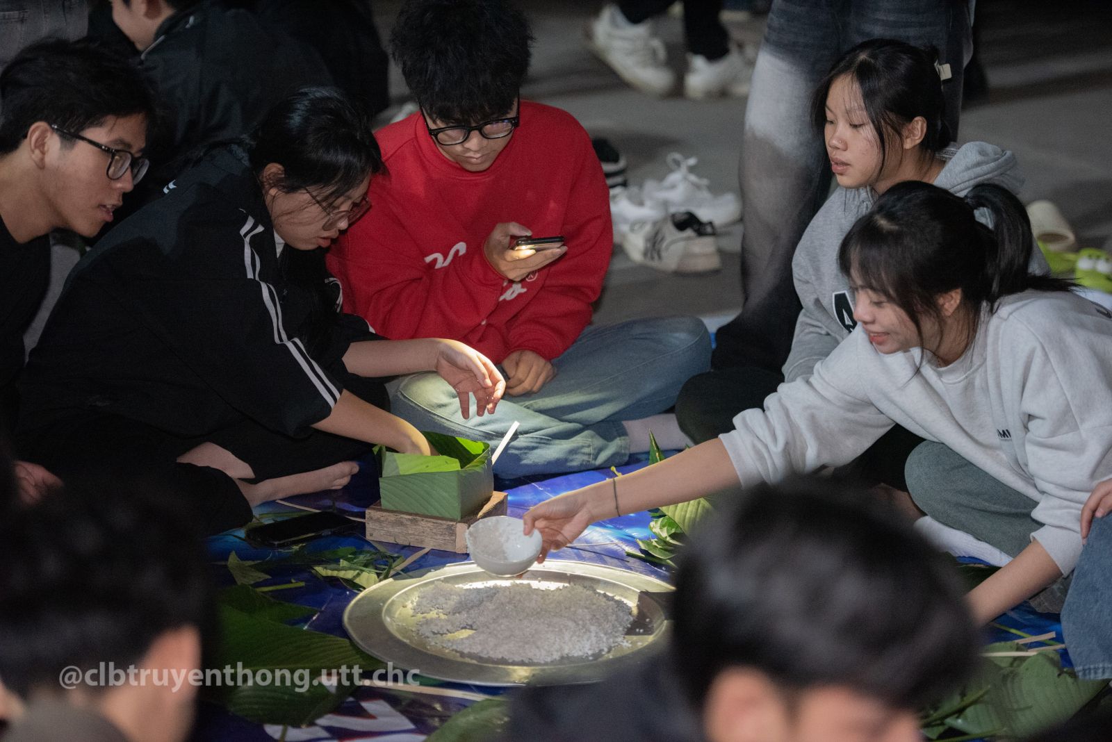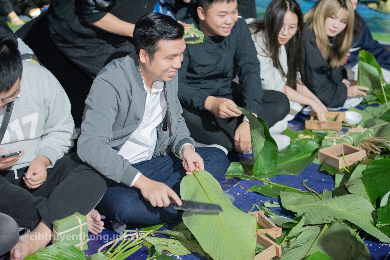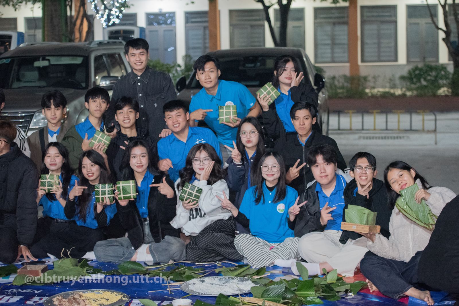 Các bạn sinh viên chụp ảnh thành quả gói bánh chưng
