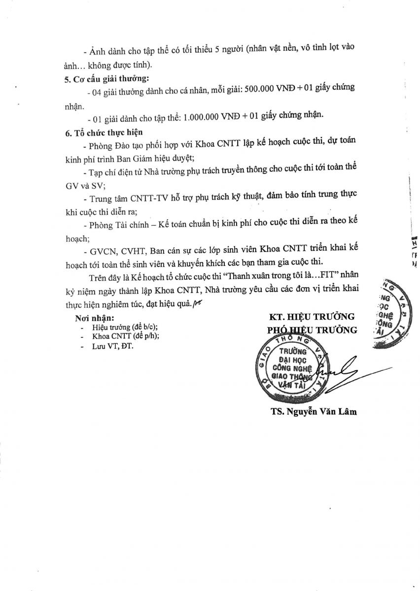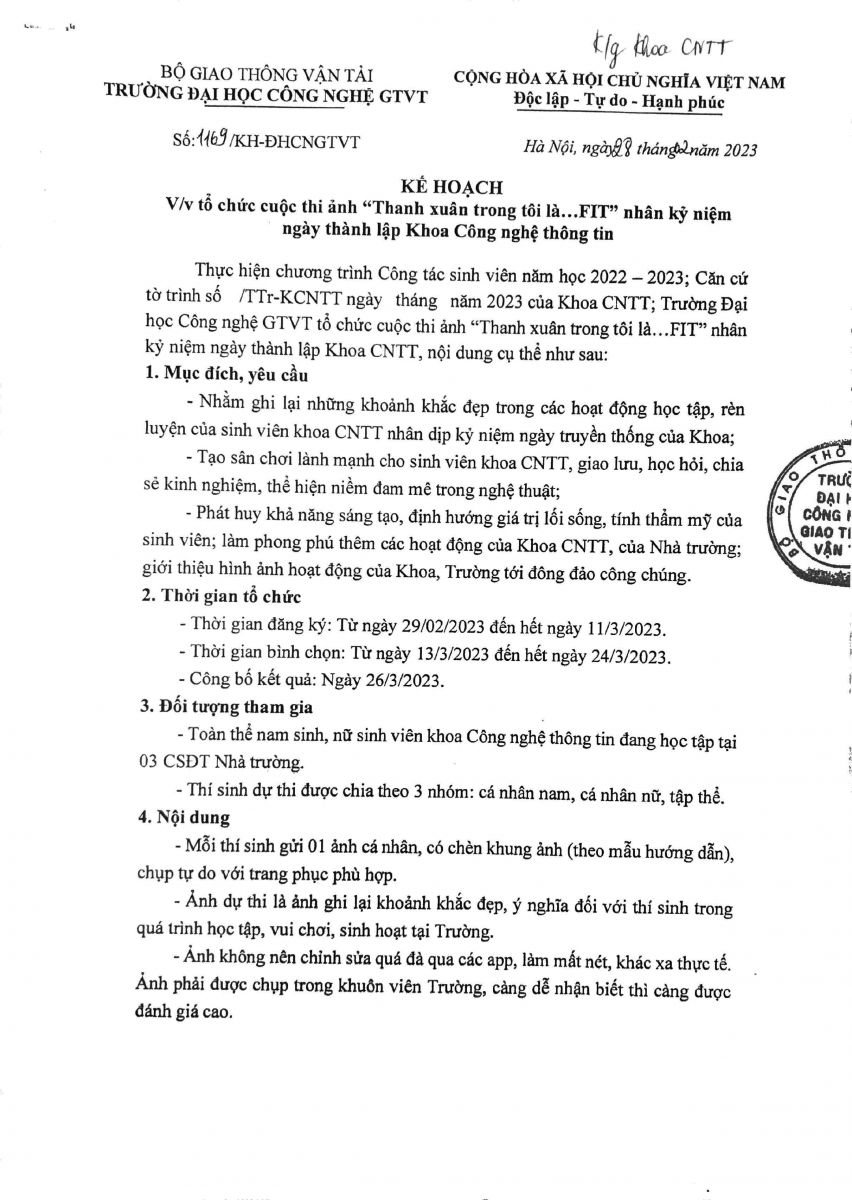 Kế hoạch tổ chức cuộc thi ảnh Thanh xuân trong tôi là...FIT nhân dịp kỷ niệm ngày thành lập Khoa Công nghệ thông tin 03/03/2023 13:03