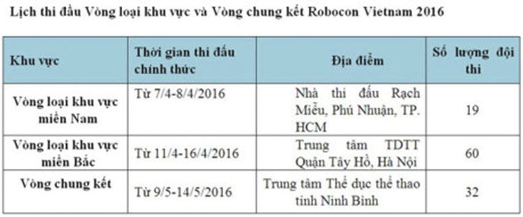 Tại khu vực phía Nam, vòng loại cuộc thi Robot Việt Nam 2016 diễn ra từ ngày 07 đến 08/4 với sự tham gia của 19 đội. Vòng chung kết toàn quốc Robocon Việt Nam 2016 diễn ra tại Ninh Bình trong tháng 5-2016.