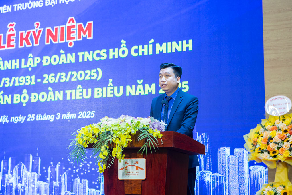Phát biểu tại buổi lễ, TS. Nguyễn Mạnh Hùng, Ủy viên Ban Thường vụ Đảng ủy, Phó Hiệu trưởng Nhà trường khẳng định: "Trải qua 94 năm hình thành và phát triển, Đoàn TNCS Hồ Chí Minh đã khẳng định vai trò quan trọng trong sự nghiệp giáo dục, đào tạo thế hệ trẻ. Nhà trường luôn quan tâm và tạo mọi điều kiện để tổ chức Đoàn phát huy vai trò xung kích, tiên phong trong học tập, nghiên cứu khoa học, rèn luyện kỹ năng và tham gia các hoạt động xã hội. Các cán bộ Đoàn tiêu biểu được tuyên dương hôm nay là những tấm gương sáng, góp phần xây dựng môi trường học tập và hoạt động phong trào ngày càng sôi động, chất lượng.”