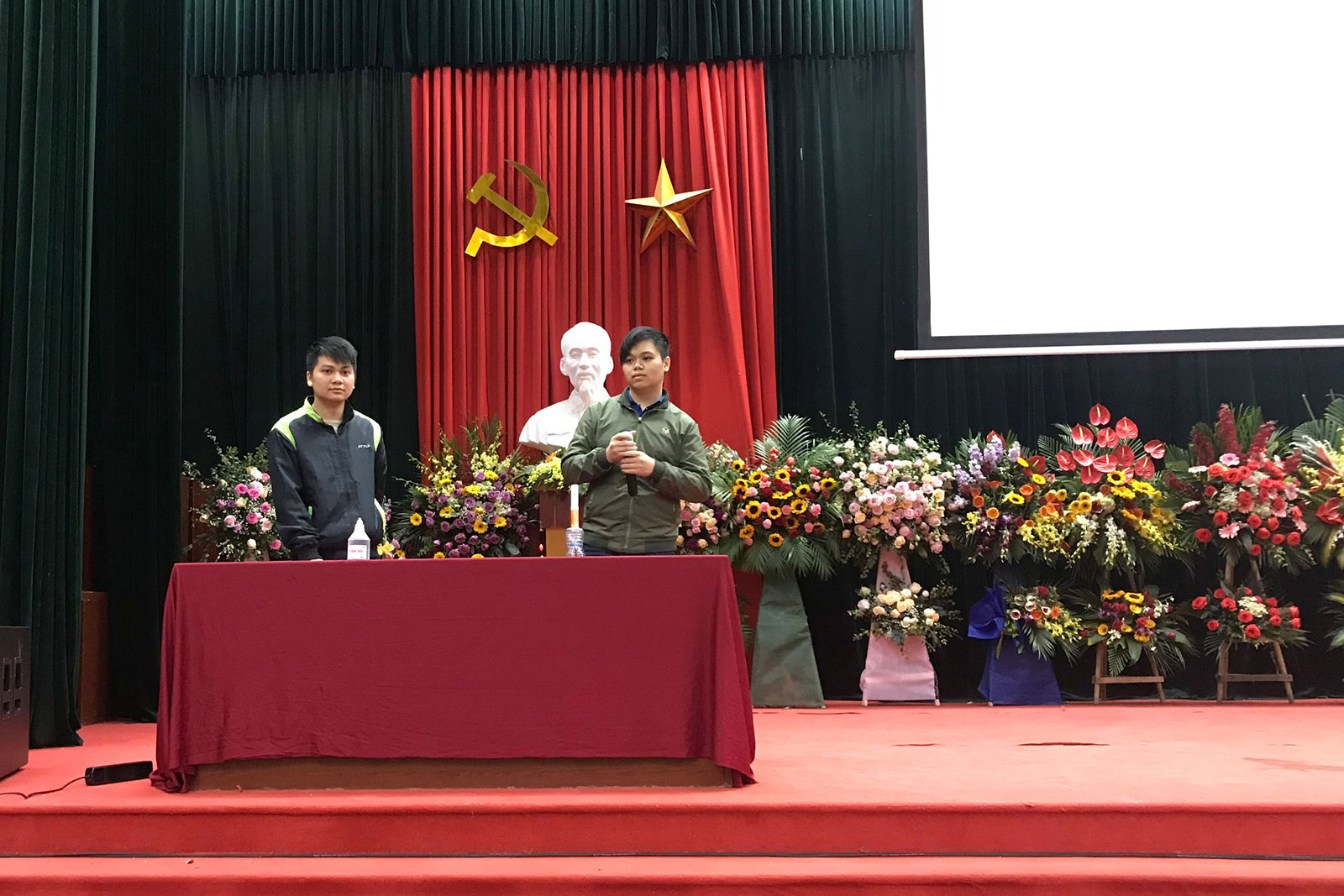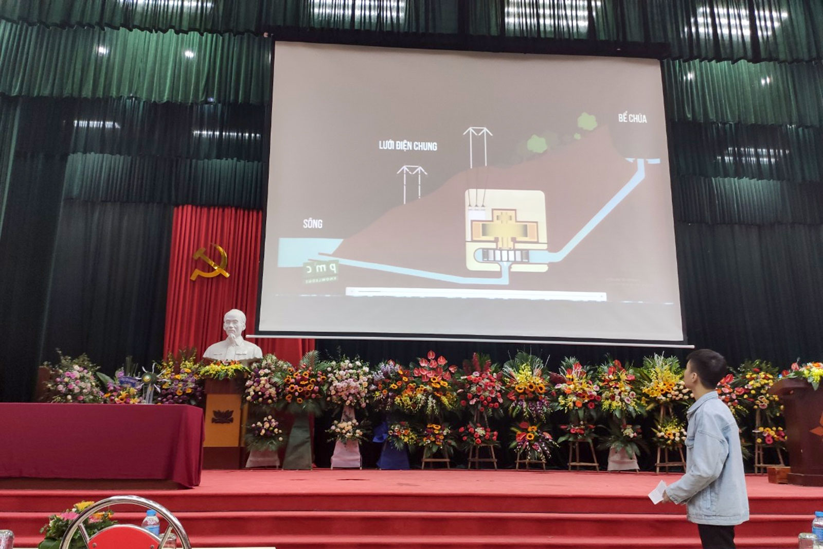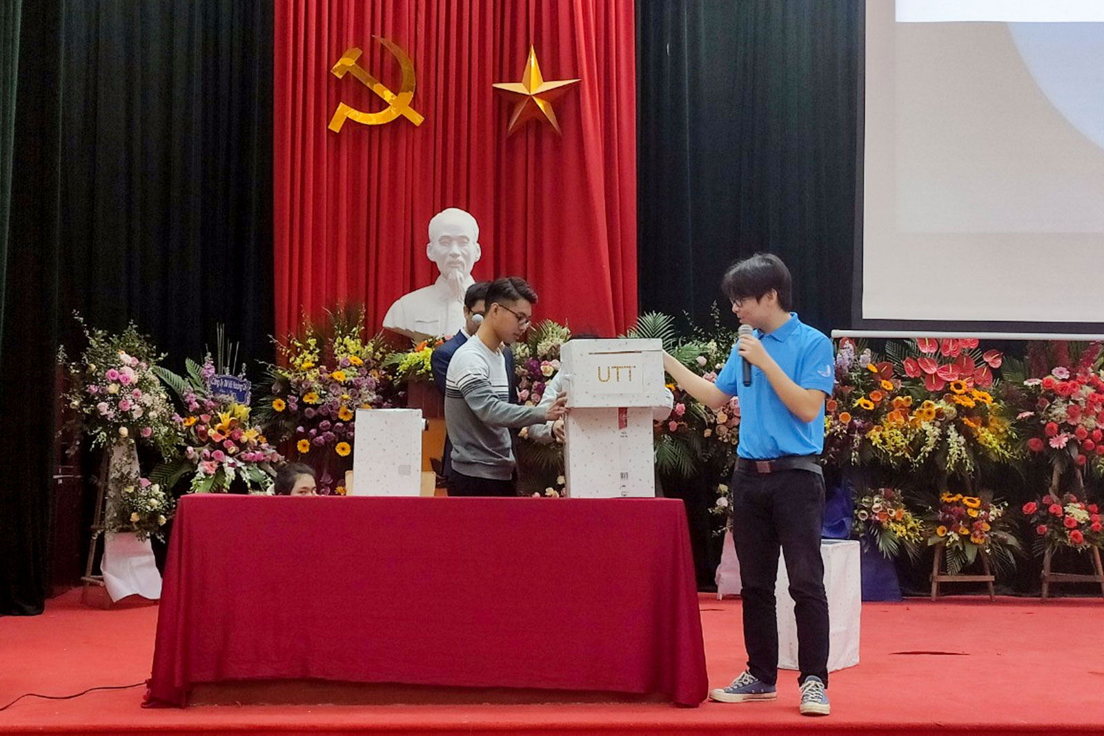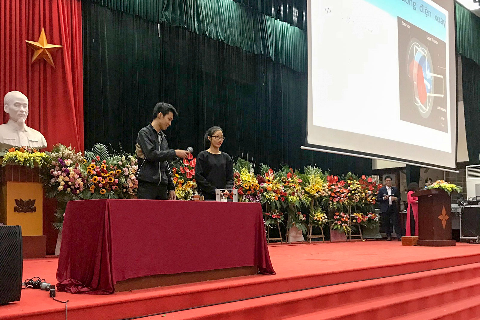 Sinh viên của đội thi duy nhất đến từ cơ sở Vĩnh Phúc trình bày sản phẩm minh họa chuyển động bằng phản lực