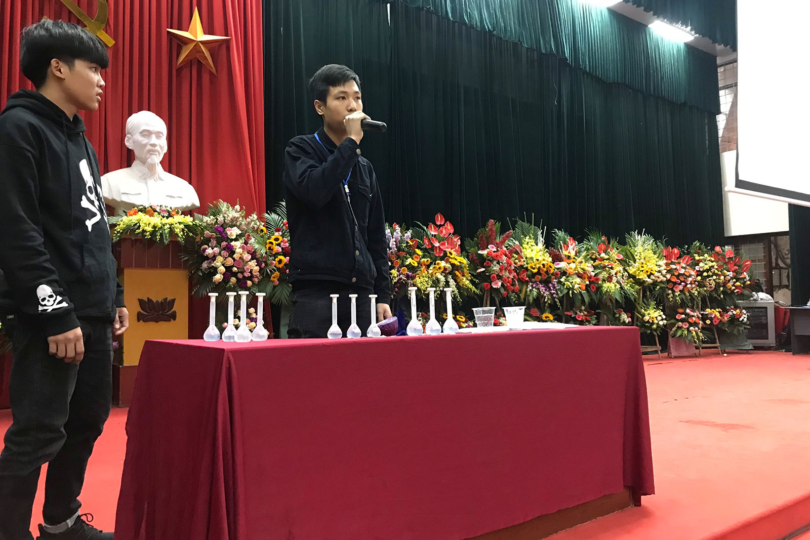 Sinh viên trong nhóm của đội thi lớp 70DCCK23 trình bày và làm thí nghiệm để chế tạo chất chỉ thị màu – một sản phẩm rất hữu ích, có nhiều ứng dụng trong thực tế, phần thi thuộc lĩnh vực Hóa học