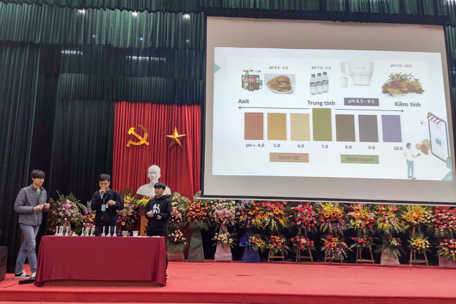 Thành viên trong nhóm giới thiệu sản phẩm và trả lời câu hỏi từ Ban giám khảo