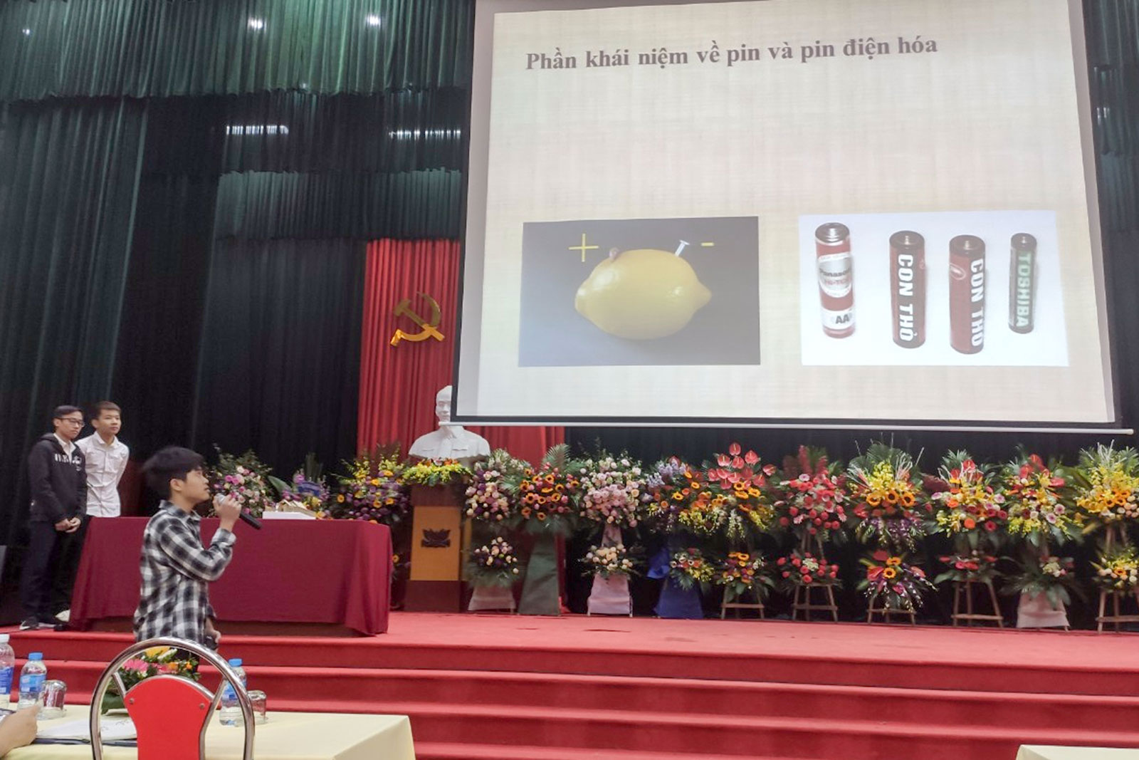 Một bài thi khác thuộc lĩnh vực hoá học của nhóm lớp 70DCCK23, dùng chính những quả chanh để thắp sáng bóng đèn
