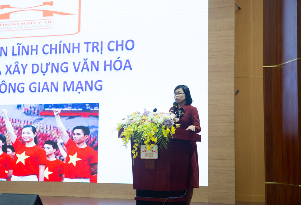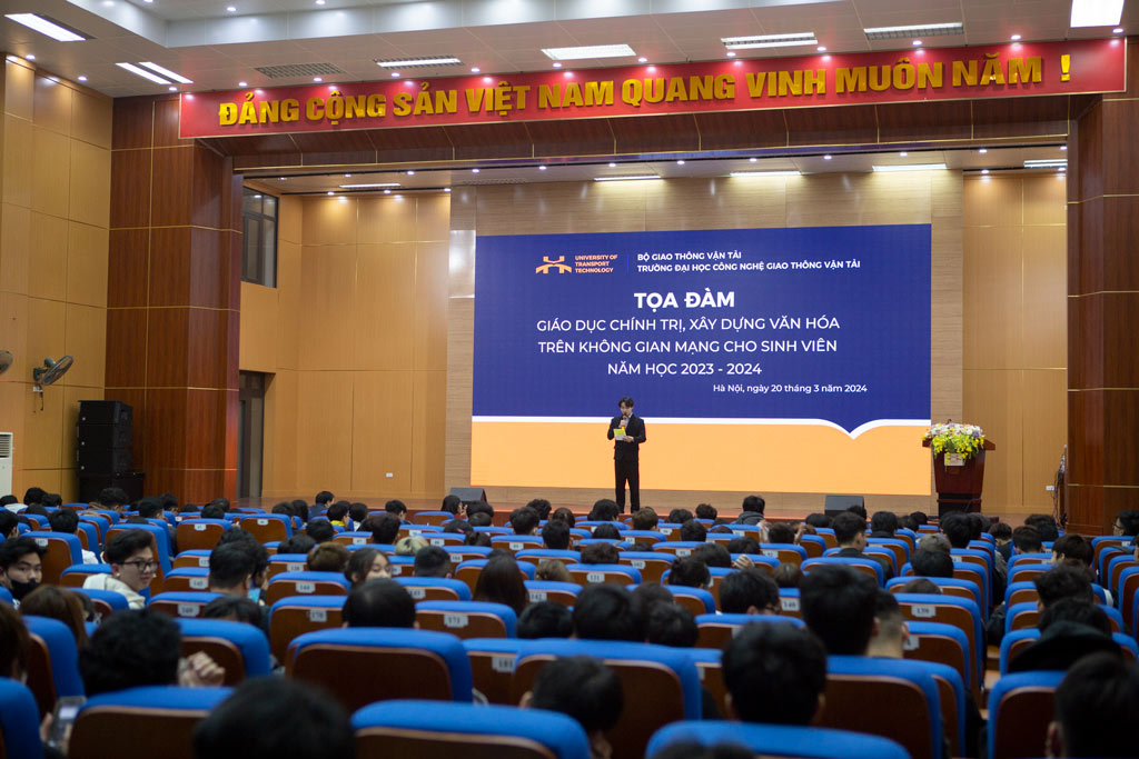 Ngày 20/3, Trường Đại học Công nghệ GTVT tổ chức chương trình tọa đàm giáo dục chính trị, xây dựng văn hóa trên không gian mạng cho sinh viên năm học 2023-2024 nhằm giúp sinh viên có thêm kiến thức, kỹ năng, tư duy về không gian mạng, tạo môi trường văn hóa lành mạnh, xây dựng mối quan hệ tốt đẹp xây dựng nếp sống thanh niên thanh lịch, văn minh trong và ngoài trường.