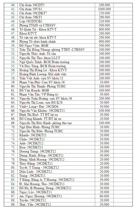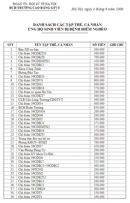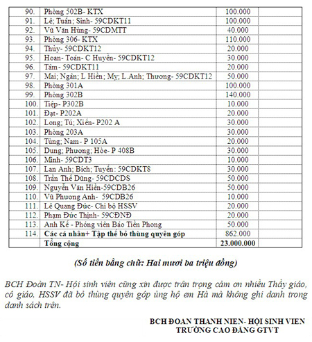 BCH đoàn TN- Hội sinh viên trường xin trân trọng cảm ơn tấm lòng vàng của quý Thầy cô giáo, các bạn HSSV, các anh chị trong và ngoài trường đã ủng hộ về vật chất; động viên về tinh thần giúp đỡ sinh viên Hoàng Thị Hà- 59CĐKT9 điều trị bạo bệnh. Chúng tôi đã kịp thời chuyển số tiền 23.000.000 đồng (Hai mươi ba triệu đồng) đến gia đình em Hà. Chúng tôi sẽ tiếp tục làm cầu nối giữa Quý thầy cô giáo, các bạn HSSV với em Hà để giúp em có thể chiến thắng được bệnh tật, nhanh chóng trở lại học tập và cuộc sống thường nhật. Địa chỉ: Văn phòng đoàn trường Cao đẳng GTVT- 54 Triều Khúc- Thanh Xuân- Hà Nội. ĐT 04.35520949. Hoặc có thể gửi trực tiếp tới em Hà- giường bệnh 18, nhà C8, Bệnh viện huyết học truyền máu Trung Ương, DĐ: 01675 692 160.