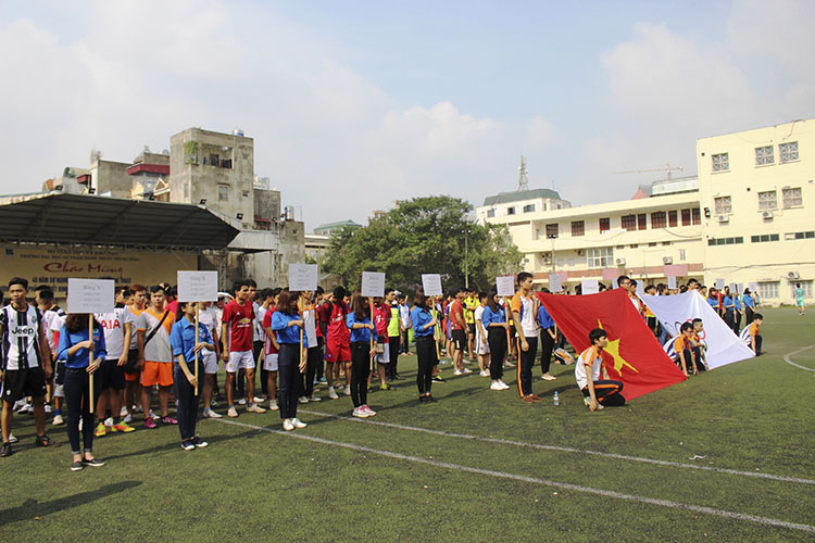 Tập thể CB-GV-CNV cùng các VĐV thực hiện nghi lễ chào cờ.