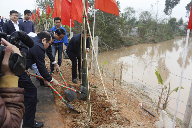 Các đồng chí đại biểu và tuổi trẻ UTT trồng cây trên tuyến đường Phúc Hòa – Long Xuyên thuộc huyện Phúc Thọ - TP. Hà Nội