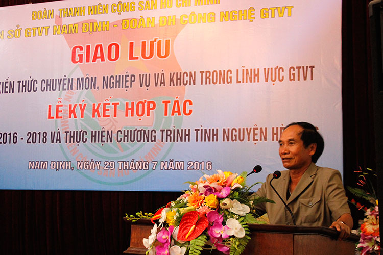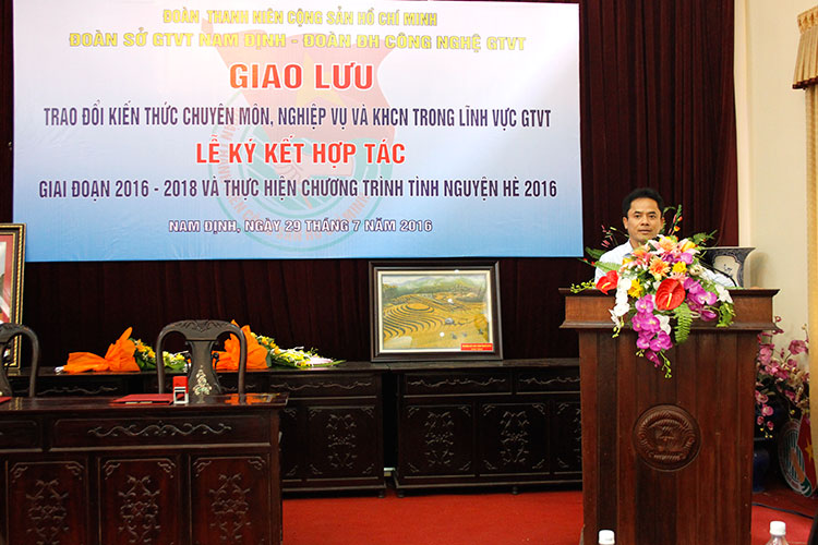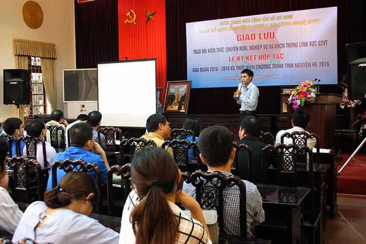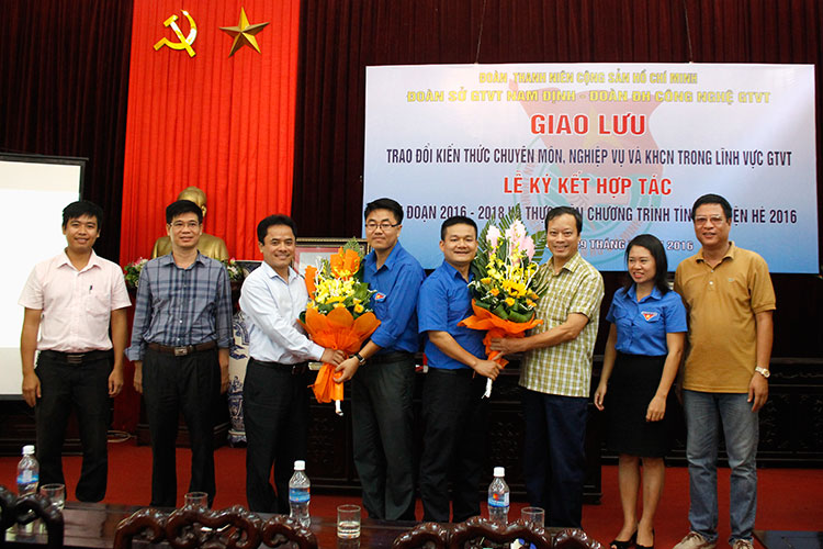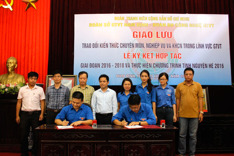 Được sự đồng ý, tạo điều kiện của lãnh đạo nhà trường, trong 3 ngày từ 29/7 đến 31/7/2016, Ban Chấp hành Đoàn Trường Đại học Công nghệ GTVT phối hợp cùng Ban Chấp hành Đoàn Sở GTVT Nam Định tổ chức Chương trình giao lưu, trao đổi kiến thức về chuyên môn, nghiệp vụ và khoa học công nghệ đồng thời Ký kết hợp tác giai đoạn 2016-2018 và hoạt động tình nguyện hè 2016 tại tỉnh Nam Định.