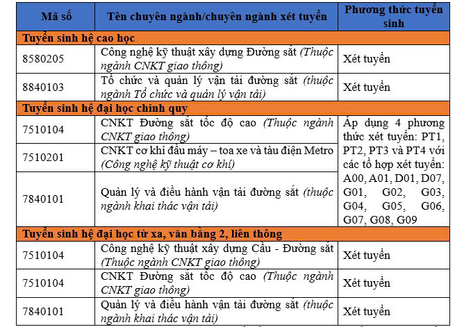 Năm 2025, Trường Đại học Công nghệ Giao thông Vận Tải tiếp tục tuyển sinh Đại học ngành Xây dựng đường sắt tốc độ cao các hệ đào tạo như: thạc sĩ, đại học chính quy, hệ đào tạo từ xa, văn bằng 2, và vừa học vừa làm. Cụ thể: