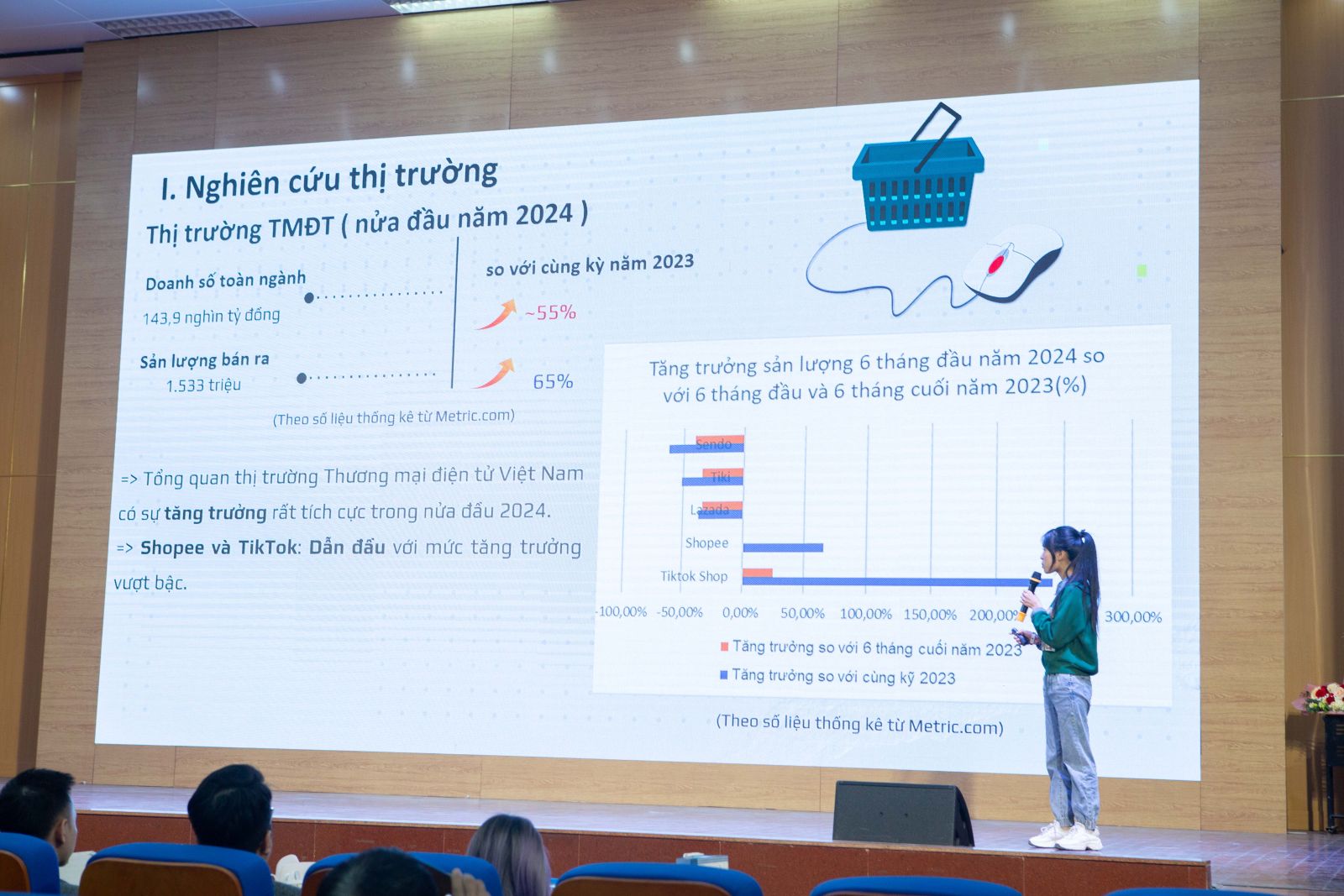 Phát biểu tại Cuộc thi, TS. Nguyễn Văn Lâm - Phó Hiệu trưởng Nhà trường nhấn mạnh, ngành thương mại điện tử ngày càng khẳng định vai trò quan trọng trong đời sống kinh tế - xã hội, khi mang lại sự tiện lợi và hiệu quả cho cả người tiêu dùng và doanh nghiệp. Thương mại điện tử không chỉ giúp tiết kiệm thời gian, chi phí mà còn mở ra cơ hội tiếp cận thị trường rộng lớn, thúc đẩy cạnh tranh và phát triển kinh doanh. Bên cạnh đó còn góp phần tạo việc làm, nâng cao năng suất lao động và cải thiện chất lượng cuộc sống, trở thành động lực quan trọng cho sự phát triển kinh tế - xã hội bền vững. Tham gia cuộc thi là cơ hội để sinh viên thể hiện đam mê, sáng tạo và khám phá tri thức mới, từ đó góp phần xây dựng một tương lai thông minh và hiện đại.