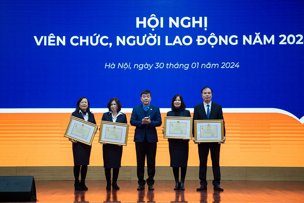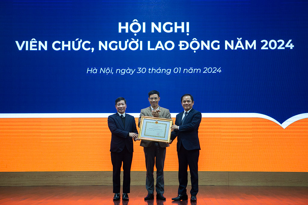 Đồng chí Quách Xuân Vinh, Phó Chủ tịch Công đoàn GTVT Việt Nam trao bằng khen cho các cá nhân có thành tích xuất sắc trong công tác năm 2023