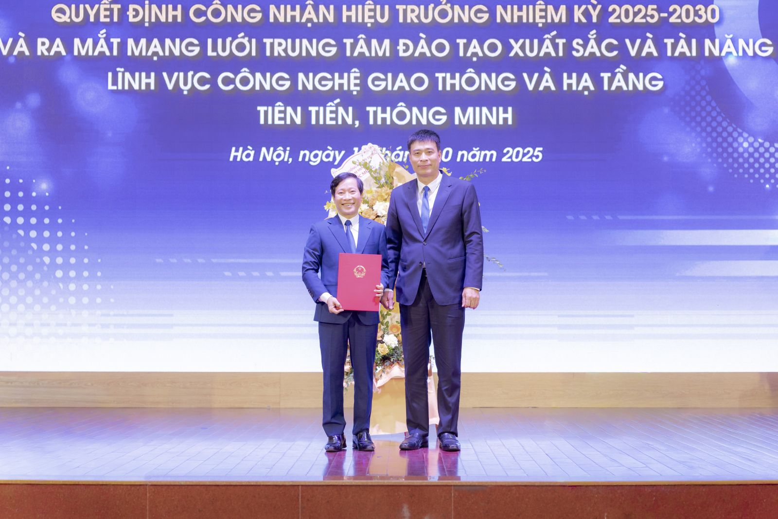 Tập thể lãnh đạo Nhà trường tặng hoa chúc mừng PGS.TS Nguyễn Hoàng Long được bổ nhiệm chức vụ Hiệu trưởng Trường Đại học Công nghệ GTVT nhiệm kỳ 2025-2030
