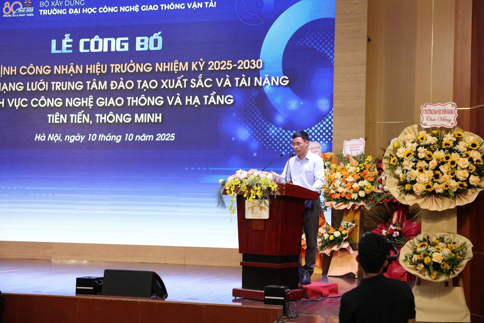 Tham dự buổi lễ có Thứ trưởng Bộ Xây dựng Phạm Minh Hà; lãnh đạo các bộ, ban, ngành Trung ương, địa phương; đại diện các trường đại học, viện nghiên cứu, doanh nghiệp đối tác cùng tập thể lãnh đạo, cán bộ, giảng viên và sinh viên Nhà trường. Thừa ủy quyền của lãnh đạo Bộ Xây dựng, đồng chí Nguyễn Văn Nghĩa - Phó Vụ trưởng Vụ Tổ chức cán bộ công bố Quyết định công nhận PGS.TS. Nguyễn Hoàng Long giữ chức Hiệu trưởng Trường Đại học Công nghệ GTVT nhiệm kỳ 2025-2030.