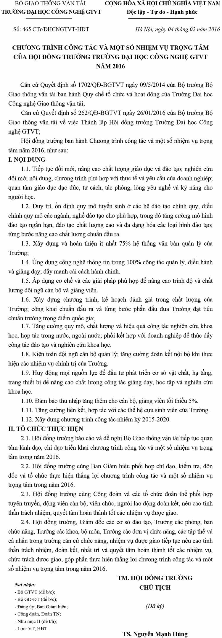 Chương trình công tác và một số nhiệm vụ trọng tâm của Hội đồng trường Trường Đại học Công nghệ GTVT năm 2016 07/03/2016 09:03