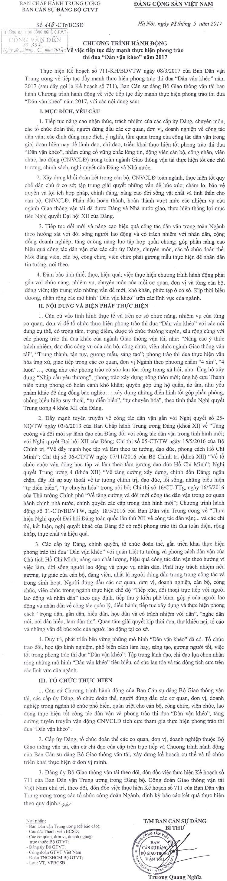 Chương trình hành động về việc tiếp tục đẩy mạnh thực hiện phong trào thi đua “Dân vận khéo” năm 2017 25/05/2017 16:05