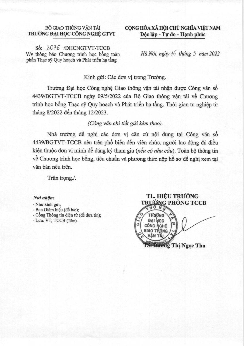 Chương trình học bổng toàn phần Thạc sĩ Quy hoạch và Phát triển hạ tầng 20/05/2022 08:05 File đính kèm 20220509_4439.BGTVT-TCCB-491--Tiep-.pdf 20220509_4439.BGTVT-TCCB-491.pdf Tin liên quan Thông báo về việc cập nhật thông tin Căn cước công dân cho người phụ thuộc 30/10/2025 Kế hoạch tổ chức Toạ đàm khoa học “Vai trò của Trí tuệ nhân tạo và công nghệ mới trong nâng cao hiệu quả nghiên cứu lĩnh vực tài chính kế toán” 24/10/2025 Thông báo về việc cử cán bộ tham gia khóa bồi dưỡng tại Học viện Ngoại giao 20/10/2025 Về việc lấy ý kiến góp ý vào dự thảo Quyết định ban hành Quy định về công tác thi đua, khen thưởng của Trường Đại học Công nghệ GTVT 09/10/2025 Thông báo về việc thống kê khối lượng hoạt động phục vụ cộng đồng của giảng viên năm học 2024-2025 02/10/2025 Kê khai khối lượng hoạt động khoa học và công nghệ phục vụ thanh toán khối lượng thừa giờ năm học 2024-2025 01/10/2025
