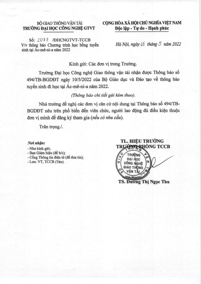 Chương trình học bổng tuyển sinh tại Ác-mê-ni-a năm 2022 20/05/2022 08:05 File đính kèm 20220510_494.TB-BGDDT-502--Tiep-.PDF 20220510_494.TB-BGDDT-502.pdf Tin liên quan Kế hoạch tổ chức Toạ đàm khoa học “Vai trò của Trí tuệ nhân tạo và công nghệ mới trong nâng cao hiệu quả nghiên cứu lĩnh vực tài chính kế toán” 24/10/2025 Thông báo về việc cử cán bộ tham gia khóa bồi dưỡng tại Học viện Ngoại giao 20/10/2025 Về việc lấy ý kiến góp ý vào dự thảo Quyết định ban hành Quy định về công tác thi đua, khen thưởng của Trường Đại học Công nghệ GTVT 09/10/2025 Thông báo về việc thống kê khối lượng hoạt động phục vụ cộng đồng của giảng viên năm học 2024-2025 02/10/2025 Kê khai khối lượng hoạt động khoa học và công nghệ phục vụ thanh toán khối lượng thừa giờ năm học 2024-2025 01/10/2025 Tổ chức lớp bồi dưỡng nghiệp vụ sư phạm và bồi dưỡng tiêu chuẩn chức danh nghề nghiệp giảng viên đại học 01/10/2025