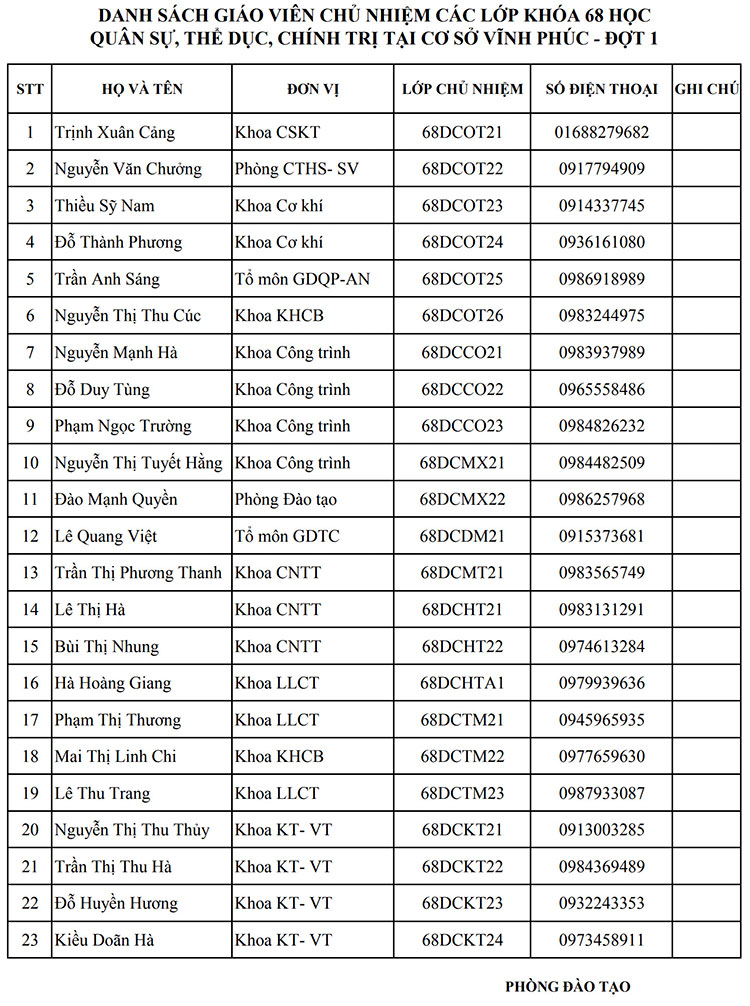 Danh sách giáo viên chủ nhiệm các lớp Khóa 68 học quân sự, thể dục, chính trị tại cơ sở Vĩnh Phúc - đợt 1 03/08/2017 16:08 File đính kèm DANH-SACH-GVCN-DOT-1.2017-2018.pdf