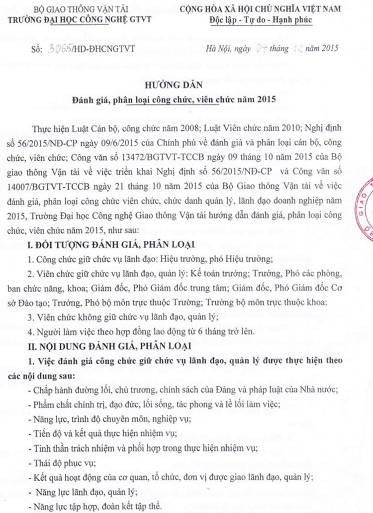 Hướng dẫn Đánh giá, phân loại công chức, viên chức năm 2015 04/12/2015 00:12 Nội dung chi tiết của văn bản đề nghị xem tại tệp đính kèm./. File đính kèm danh-sach-tong-hop-ket-qua-phan-loai-vien-chuc-2015.doc huong-dan-danh-gia-phan-loai-vien-chuc-2015.doc huong-dan-danh-gia-phan-loai-vien-chuc-2015.pdf phieu-bo-sung-ly-lich-can-bo-vien-chuc.doc phieu-danh-gia-phan-loai-theo-bieu-mau-01-02-03.doc Tin liên quan Thông báo về việc đăng ký tham dự Hội thảo “Cùng nhau vươn lên: Kỹ năng lãnh đạo cho tương lai của giáo dục đại học tại Việt Nam và Đông Nam Á” 12/11/2025 Thông báo về việc cập nhật thông tin Căn cước công dân cho người phụ thuộc 30/10/2025 Kế hoạch tổ chức Toạ đàm khoa học “Vai trò của Trí tuệ nhân tạo và công nghệ mới trong nâng cao hiệu quả nghiên cứu lĩnh vực tài chính kế toán” 24/10/2025 Thông báo về việc cử cán bộ tham gia khóa bồi dưỡng tại Học viện Ngoại giao 20/10/2025 Về việc lấy ý kiến góp ý vào dự thảo Quyết định ban hành Quy định về công tác thi đua, khen thưởng của Trường Đại học Công nghệ GTVT 09/10/2025 Thông báo về việc thống kê khối lượng hoạt động phục vụ cộng đồng của giảng viên năm học 2024-2025 02/10/2025 Tin nổi bật Bộ Xây dựng tổ chức Hội nghị công tác đào tạo khối các trường đại học thuộc Bộ 06/11/2025 17:11 Sinh viên chuyên ngành Trí tuệ nhân tạo & Giao thông thông minh UTT: Kiến tạo tương lai cùng doanh nghiệp 04/11/2025 08:11 UTT Awards 2025: Khi người học nói lời tri ân những người Tận tâm- Tận hiến vì UTT 29/10/2025 14:10 UTT ra mắt Mạng lưới trung tâm đào tạo xuất sắc và tài năng trong lĩnh vực Công nghệ giao thông và Hạ tầng tiên... 10/10/2025 13:10 Thông tin mới nhất Trường Đại học Công nghệ GTVT tăng cường hợp tác quốc tế với Trường Đại học Công nghệ Thông tin và Quản lý... 13/11/2025 10:11 Thông báo về việc đăng ký tham dự Hội thảo “Cùng nhau vươn lên: Kỹ năng lãnh đạo cho tương lai của giáo dục đại... 12/11/2025 15:11 Tọa đàm khoa học: Vai trò của trí tuệ nhân tạo trong nghiên cứu và giảng dạy lĩnh vực tài chính - kế toán 11/11/2025 10:11 Bộ Xây dựng tổ chức Hội nghị công tác đào tạo khối các trường đại học thuộc Bộ 06/11/2025 17:11 Đại hội Hội Cựu chiến binh Trường Đại học Công nghệ GTVT nhiệm kỳ 2025-2030 04/11/2025 15:11