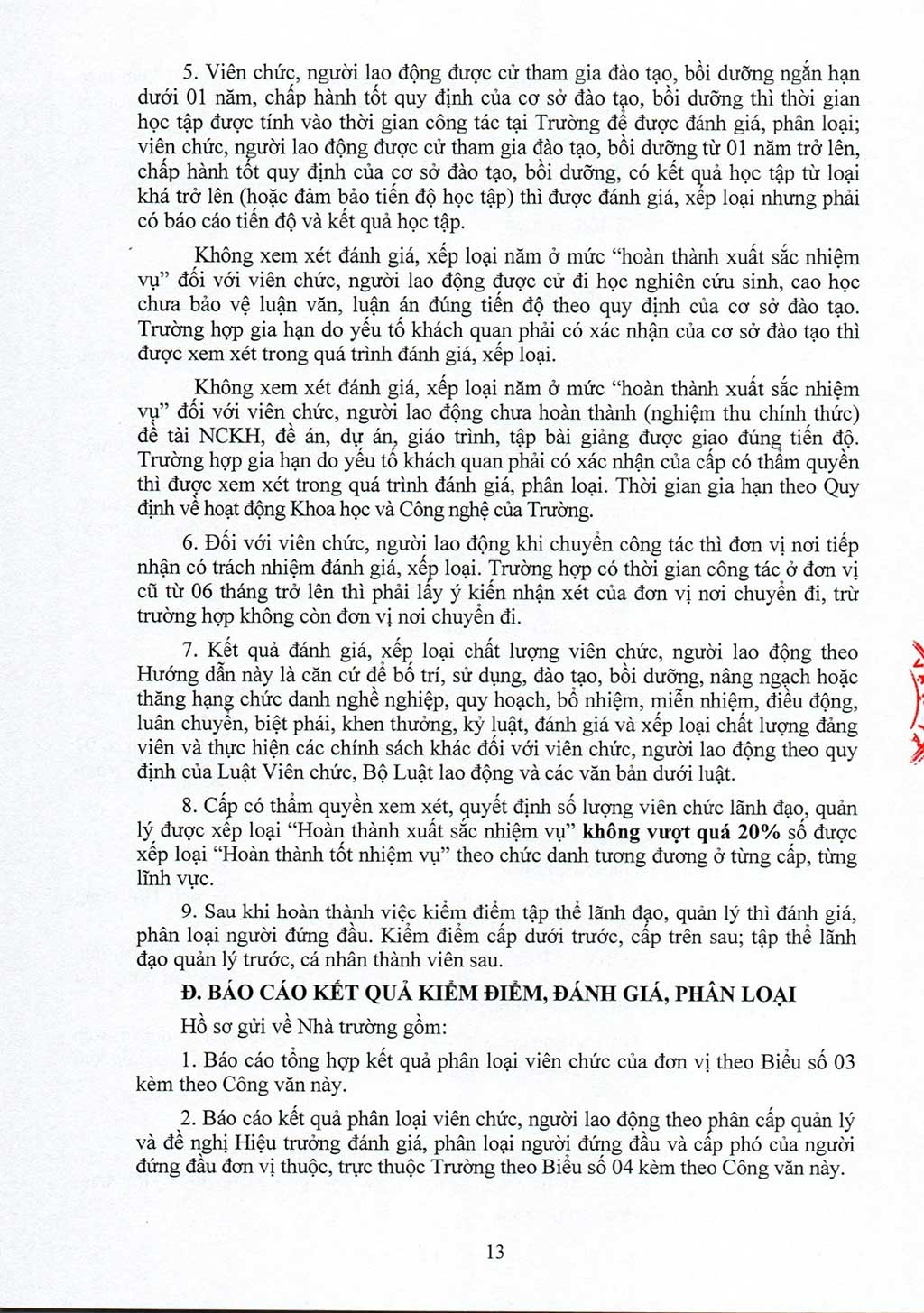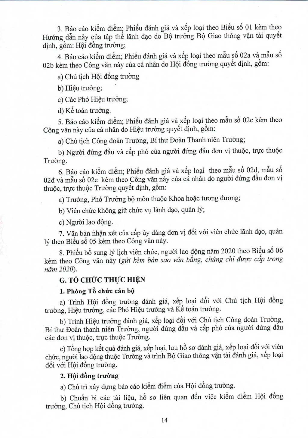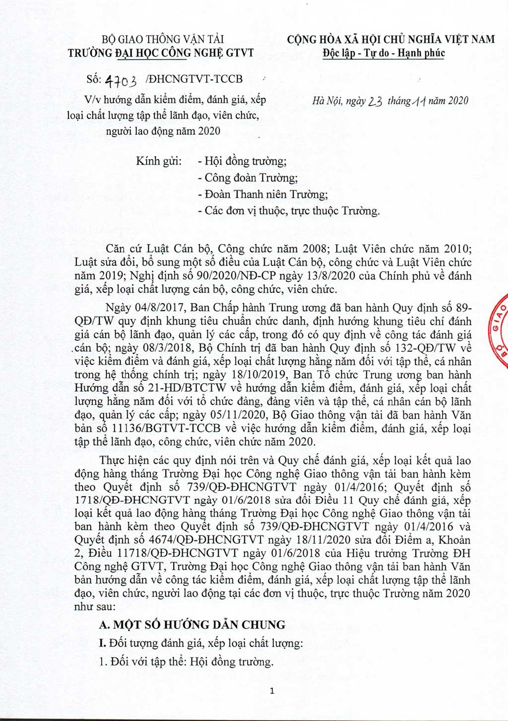 Hướng dẫn kiểm điểm, đánh giá, xếp loại chất lượng tập thể lãnh đạo, viên chức, người lao động năm 2020 25/11/2020 10:11 File đính kèm Bieu-so-5---Nhan-xet-cap-uy.docx Bieu-so-1---Tap-the.docx Bieu-so-6---Phieu-bo-sung-ly-lich.doc Bieu-so-2---Vien-chuc.docx Bieu-so-3---Tong-hop-ket-qua-phan-loai.doc Bieu-so-4---Bao-cao-ket-qua-phan-loai-ve-de-nghi-phan-loai.doc Huong-dan-kiem-diem-vien-chuc-2020.pdf Tin liên quan Thông báo về việc cập nhật thông tin Căn cước công dân cho người phụ thuộc 30/10/2025 Kế hoạch tổ chức Toạ đàm khoa học “Vai trò của Trí tuệ nhân tạo và công nghệ mới trong nâng cao hiệu quả nghiên cứu lĩnh vực tài chính kế toán” 24/10/2025 Thông báo về việc cử cán bộ tham gia khóa bồi dưỡng tại Học viện Ngoại giao 20/10/2025 Về việc lấy ý kiến góp ý vào dự thảo Quyết định ban hành Quy định về công tác thi đua, khen thưởng của Trường Đại học Công nghệ GTVT 09/10/2025 Thông báo về việc thống kê khối lượng hoạt động phục vụ cộng đồng của giảng viên năm học 2024-2025 02/10/2025 Kê khai khối lượng hoạt động khoa học và công nghệ phục vụ thanh toán khối lượng thừa giờ năm học 2024-2025 01/10/2025 Tin nổi bật UTT Awards 2025: Khi người học nói lời tri ân những người Tận tâm- Tận hiến vì UTT 29/10/2025 14:10 UTT ra mắt Mạng lưới trung tâm đào tạo xuất sắc và tài năng trong lĩnh vực Công nghệ giao thông và Hạ tầng tiên... 10/10/2025 13:10 Thông tin mới nhất Đại hội Hội Cựu chiến binh Trường Đại học Công nghệ GTVT nhiệm kỳ 2025-2030 04/11/2025 15:11 Sinh viên chuyên ngành Trí tuệ nhân tạo & Giao thông thông minh UTT: Kiến tạo tương lai cùng doanh nghiệp 04/11/2025 08:11 Vượt lên nghịch cảnh, em Trần Văn Dũng viết tiếp ước mơ khi đến với Trường Đại học Công nghệ GTVT 03/11/2025 14:11 UTT thúc đẩy hợp tác với các đối tác Úc trong đào tạo, nghiên cứu và hỗ trợ sinh viên 30/10/2025 15:10 Thông báo về việc cập nhật thông tin Căn cước công dân cho người phụ thuộc 30/10/2025 15:10