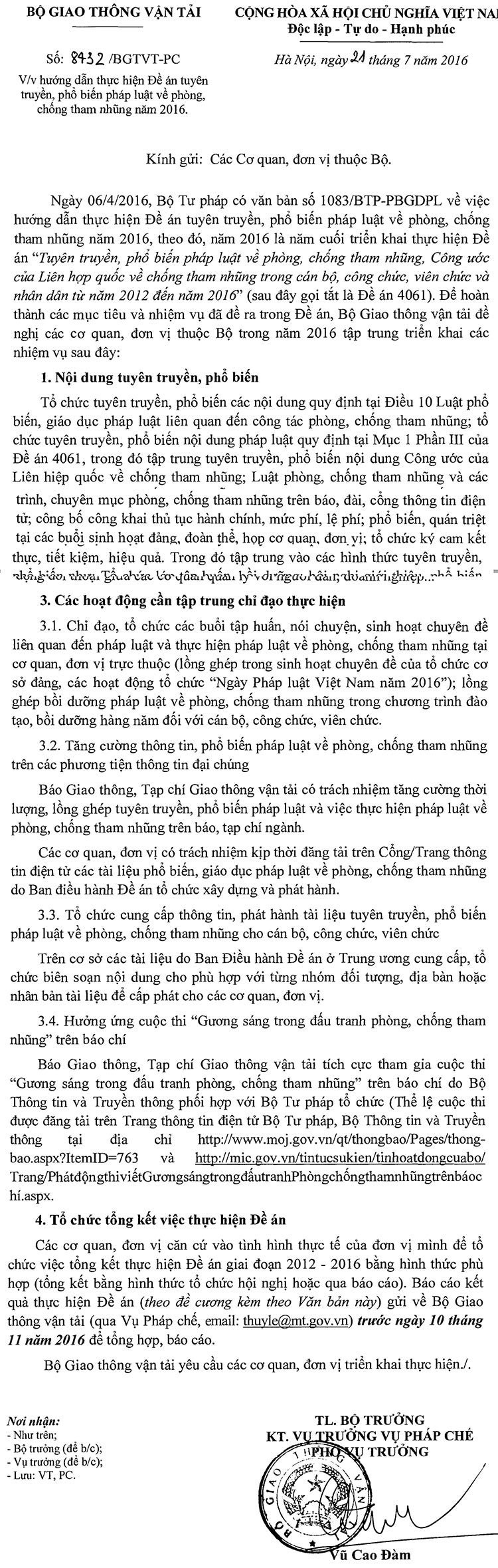 Hướng dẫn thực hiện Đề án tuyên truyền, phổ biến pháp luật về phòng chống tham nhũng năm 2016 25/07/2016 17:07 File đính kèm 21.07.2016-8432.pdf 14.2012.QH13.doc Tin liên quan Thông báo về việc đăng ký tham dự Hội thảo “Cùng nhau vươn lên: Kỹ năng lãnh đạo cho tương lai của giáo dục đại học tại Việt Nam và Đông Nam Á” 12/11/2025 Thông báo về việc cập nhật thông tin Căn cước công dân cho người phụ thuộc 30/10/2025 Kế hoạch tổ chức Toạ đàm khoa học “Vai trò của Trí tuệ nhân tạo và công nghệ mới trong nâng cao hiệu quả nghiên cứu lĩnh vực tài chính kế toán” 24/10/2025 Thông báo về việc cử cán bộ tham gia khóa bồi dưỡng tại Học viện Ngoại giao 20/10/2025 Về việc lấy ý kiến góp ý vào dự thảo Quyết định ban hành Quy định về công tác thi đua, khen thưởng của Trường Đại học Công nghệ GTVT 09/10/2025 Thông báo về việc thống kê khối lượng hoạt động phục vụ cộng đồng của giảng viên năm học 2024-2025 02/10/2025