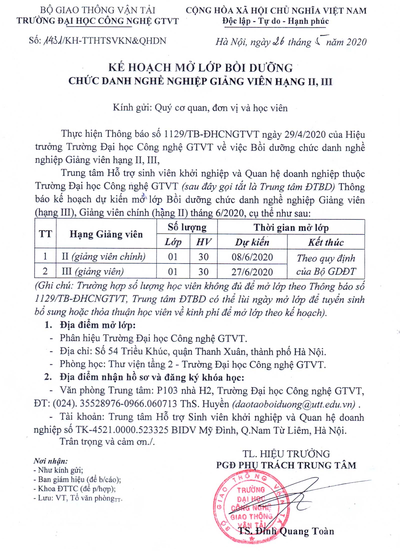 Kế hoạch mở lớp bồi dưỡng Chức danh nghề nghiệp giảng viên hạng II, III năm 2020 05/06/2020 04:06 File đính kèm 1431.pdf