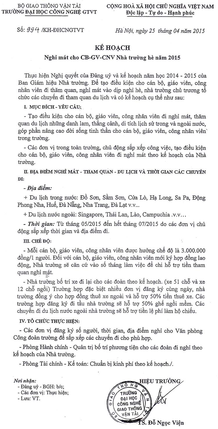 Kế hoạch nghỉ mát cho CB-GV-CNV Nhà trường hè năm 2015