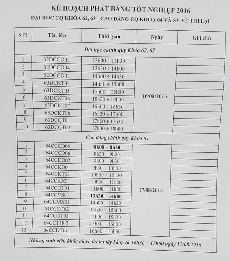 Kế hoạch phát bằng tốt nghiệp 2016 15/08/2016 20:08 Thời gian :13h00 đến 18h00, ngày 16 tháng 8 năm 2016 Địa điểm : phòng 206 nhà H3 Khi đến nhận bằng thí sinh cần mang theo Chứng minh thư nhân dân.