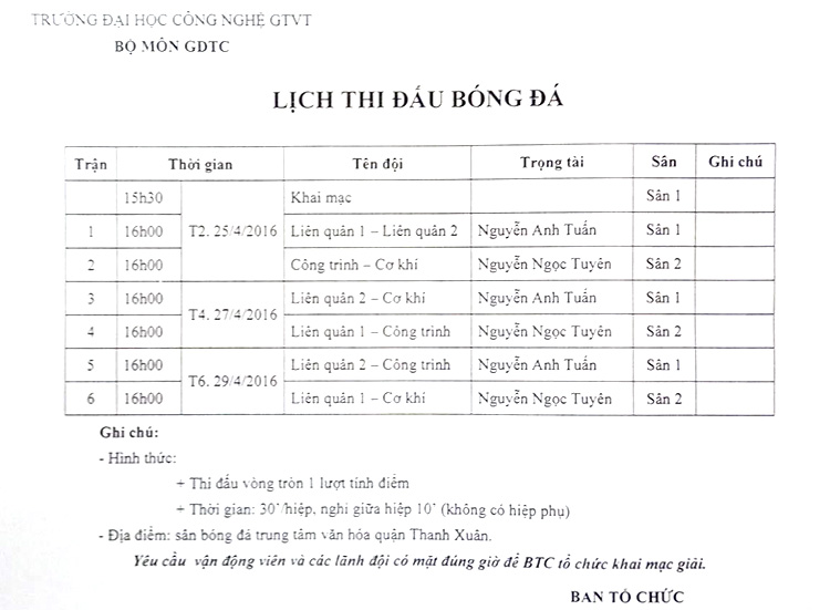 Các đội đăng ký danh sách gửi về cho ban tổ chức (VP Công đoàn Trường theo số ĐT 0438543091).
