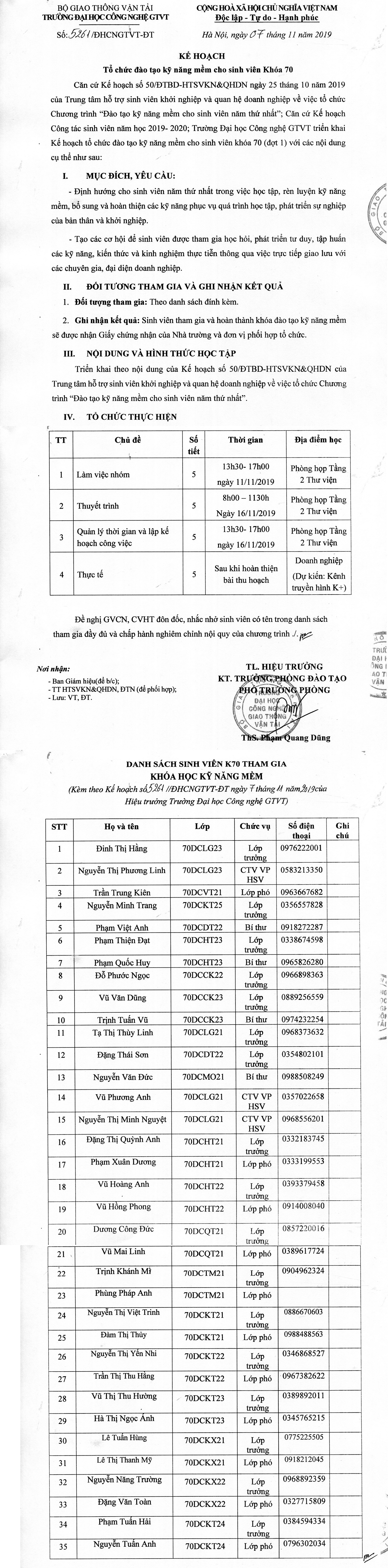 Kế hoạch Tổ chức đào tạo kỹ năng mềm cho sinh viên Khoá 70
