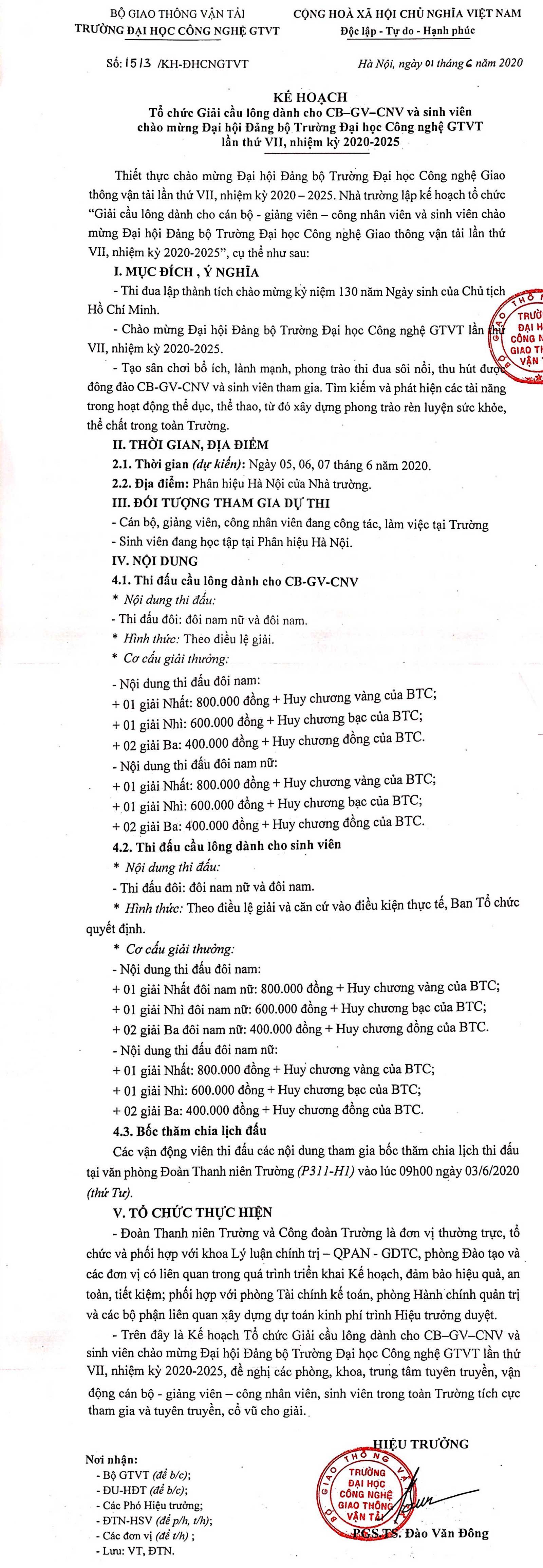 Kế hoạch Tổ chức Giải cầu lông dành cho CB-GV-CNV và sinh viên chào mừng Đại hội Đảng bộ Trường Đại học Công nghệ GTVT lần thứ VII, nhiệm kỳ 2020-2025 02/06/2020 03:06