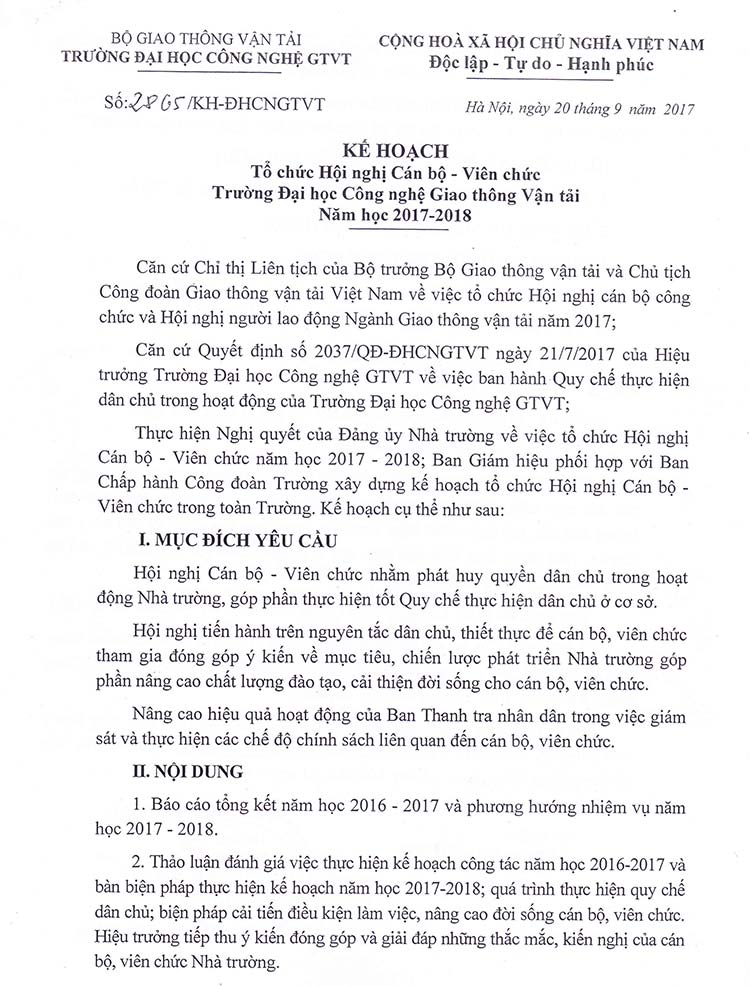 Kế hoạch tổ chức Hội nghị Cán bộ - Viên chức năm học 2017 - 2018