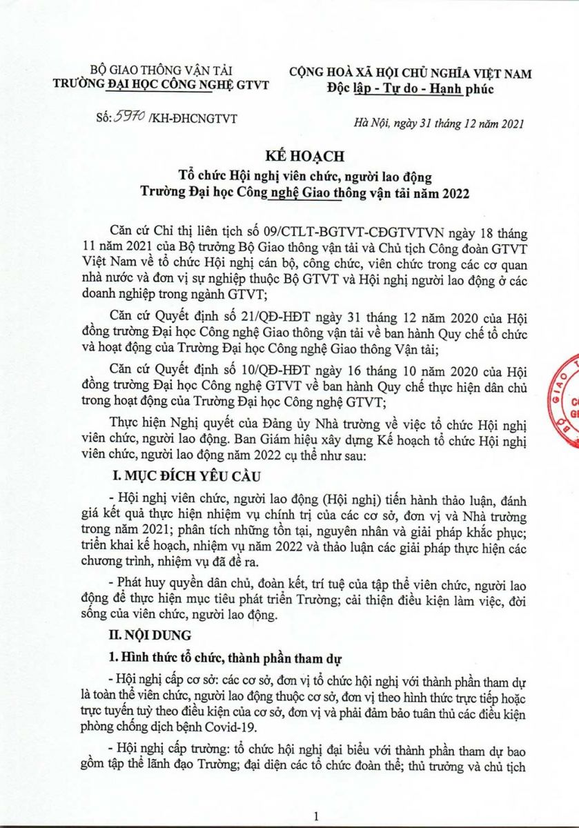 Kế hoạch tổ chức Hội nghị viên chức, người lao động Trường ĐH Công nghệ GTVT năm 2022 02/01/2022 11:01 File đính kèm 5970-KH---HCNGTVT.pdf