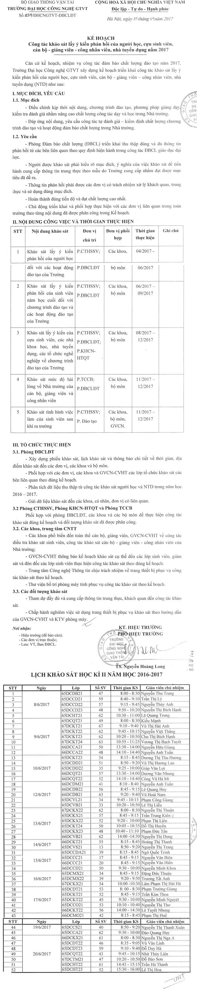 Lịch Khảo sát học kỳ II năm học 2016 - 2017