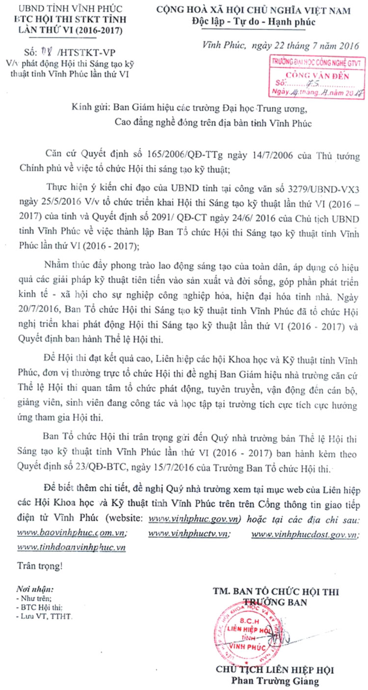 >> Kế hoạch Tổ chức Hội thi Sáng tạo Kỹ thuật tỉnh Vĩnh Phúc lần thứ VI (2016 - 2017) xem chi tiết tại tệp đính kèm!