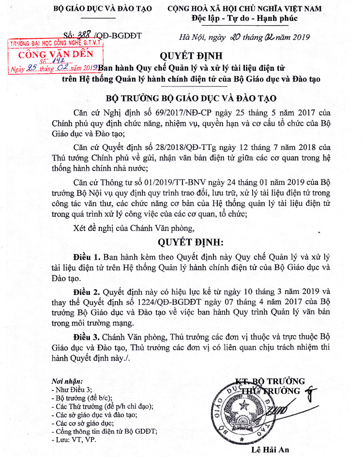 Quyết định Ban hành Quy chế Quản lý và xử lý tài liệu điện tử trên Hệ thống Quản lý hành chính điện tử của Bộ Giáo dục và Đào tạo 27/02/2019 15:02