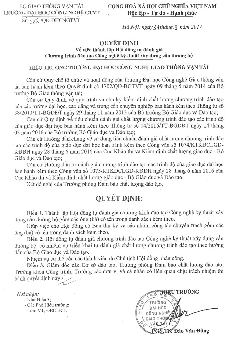 Quyết định thành lập Hội đồng tự đánh giá Chương trình đào tạo Công nghệ kỹ thuật xây dựng Cầu đường bộ 12/04/2017 09:04 File đính kèm 985-QD-DHCNGTVT.docx