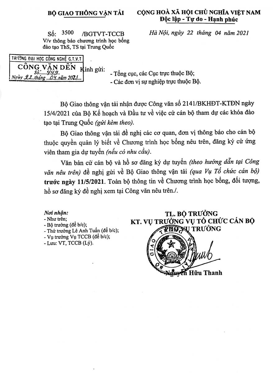 Thông báo chương trình học bổng đào tạo Thạc sỹ, Tiến sĩ tại Trung Quốc 12/05/2021 16:05 File đính kèm 011-TM-2021.jpg 2141-BKHDT-KTDN.jpg 3500-BGTVT-TCCB.jpg Tin liên quan Thông báo về việc cập nhật thông tin Căn cước công dân cho người phụ thuộc 30/10/2025 Kế hoạch tổ chức Toạ đàm khoa học “Vai trò của Trí tuệ nhân tạo và công nghệ mới trong nâng cao hiệu quả nghiên cứu lĩnh vực tài chính kế toán” 24/10/2025 Thông báo về việc cử cán bộ tham gia khóa bồi dưỡng tại Học viện Ngoại giao 20/10/2025 Về việc lấy ý kiến góp ý vào dự thảo Quyết định ban hành Quy định về công tác thi đua, khen thưởng của Trường Đại học Công nghệ GTVT 09/10/2025 Thông báo về việc thống kê khối lượng hoạt động phục vụ cộng đồng của giảng viên năm học 2024-2025 02/10/2025 Kê khai khối lượng hoạt động khoa học và công nghệ phục vụ thanh toán khối lượng thừa giờ năm học 2024-2025 01/10/2025