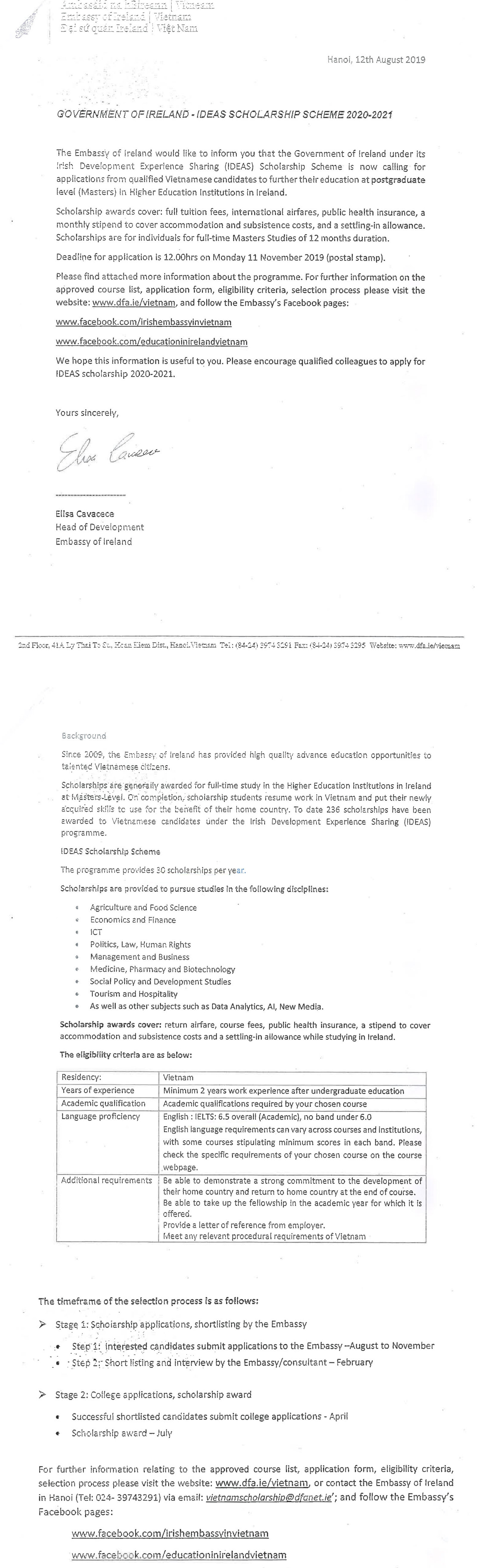 Thông báo Chương trình học bổng IDEAS của Chính phủ Ireland niên khóa 2020 - 2021