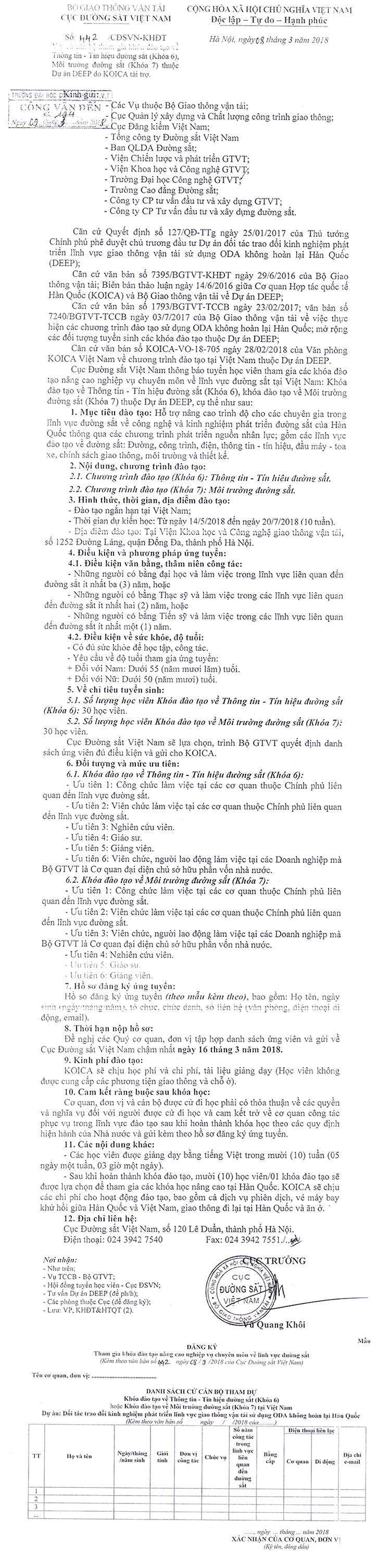Thông báo cử cán bộ tham gia khóa đào tạo về Thông tin - Tín hiệu đường sắt và khóa đào tạo Môi trường đường sắt thuộc Dự án DEEP do KOICA tài trợ 12/03/2018 15:03