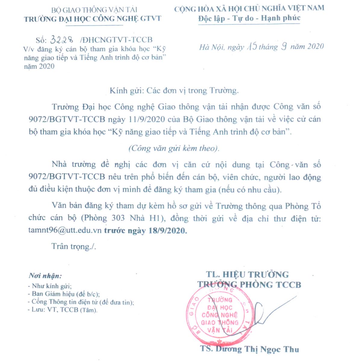 Thông báo đăng ký cán bộ tham gia khóa học Kỹ năng giao tiếp và Tiếng Anh trình độ cơ bản năm 2020 16/09/2020 04:09 File đính kèm 3228---HCNGTVT-TCCB.pdf