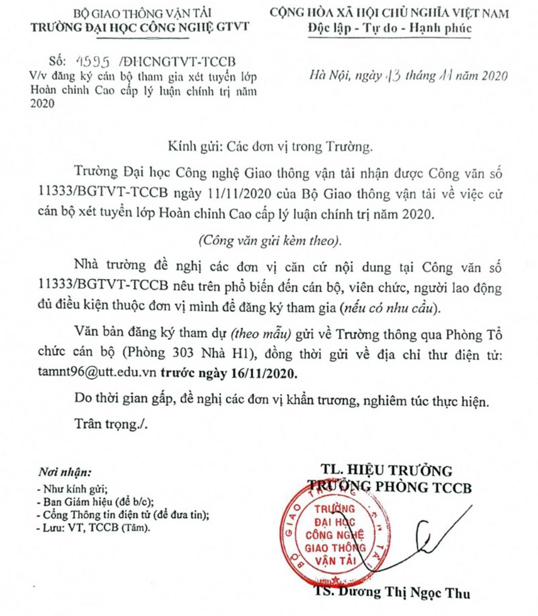 Thông báo Đăng ký cán bộ tham gia xét tuyển lớp Hoàn chỉnh Cao cấp lý luận chính trị năm 2020 13/11/2020 04:11 File đính kèm CV-11333-BGTVT-TCCB.pdf